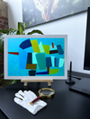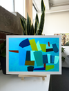 The colour palette is predominantly cool and contemplative, dominated by various shades of blue that create a sense of depth and reflection. Strategic touches of lime green and warm brown add points of contrast and energy, suggesting moments of breakthrough or challenge. Our print enhancement team have preserved the precise edges and subtle colour transitions that make this piece so powerful, ensuring that every nuance of the artist's meditation on balance and adaptation remains intact.