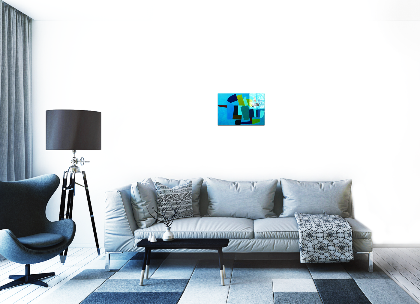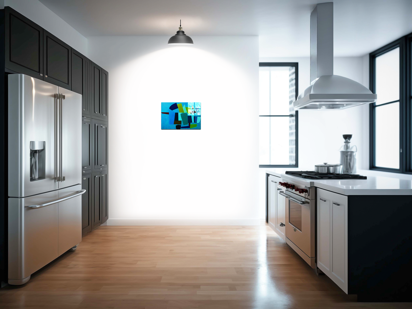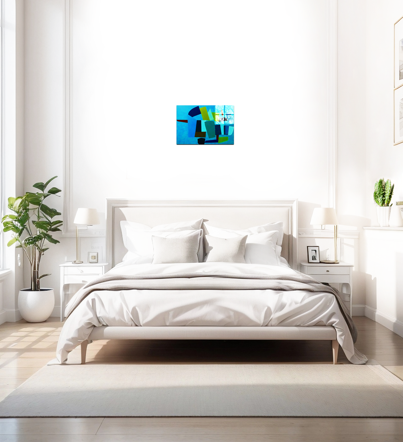 The artist's thoughtful use of colour creates a contemplative atmosphere, with a symphony of blues ranging from deep navy to bright turquoise, suggesting both challenges and opportunities. Carefully placed accents of lime green and earth tones create moments of contrast and energy, like breakthrough moments in the journey toward equilibrium. Through our precise photography and print enhancement process, we've maintained every subtle variation in tone and transition that makes this piece such a powerful statement about finding harmony in the face of opposing forces.