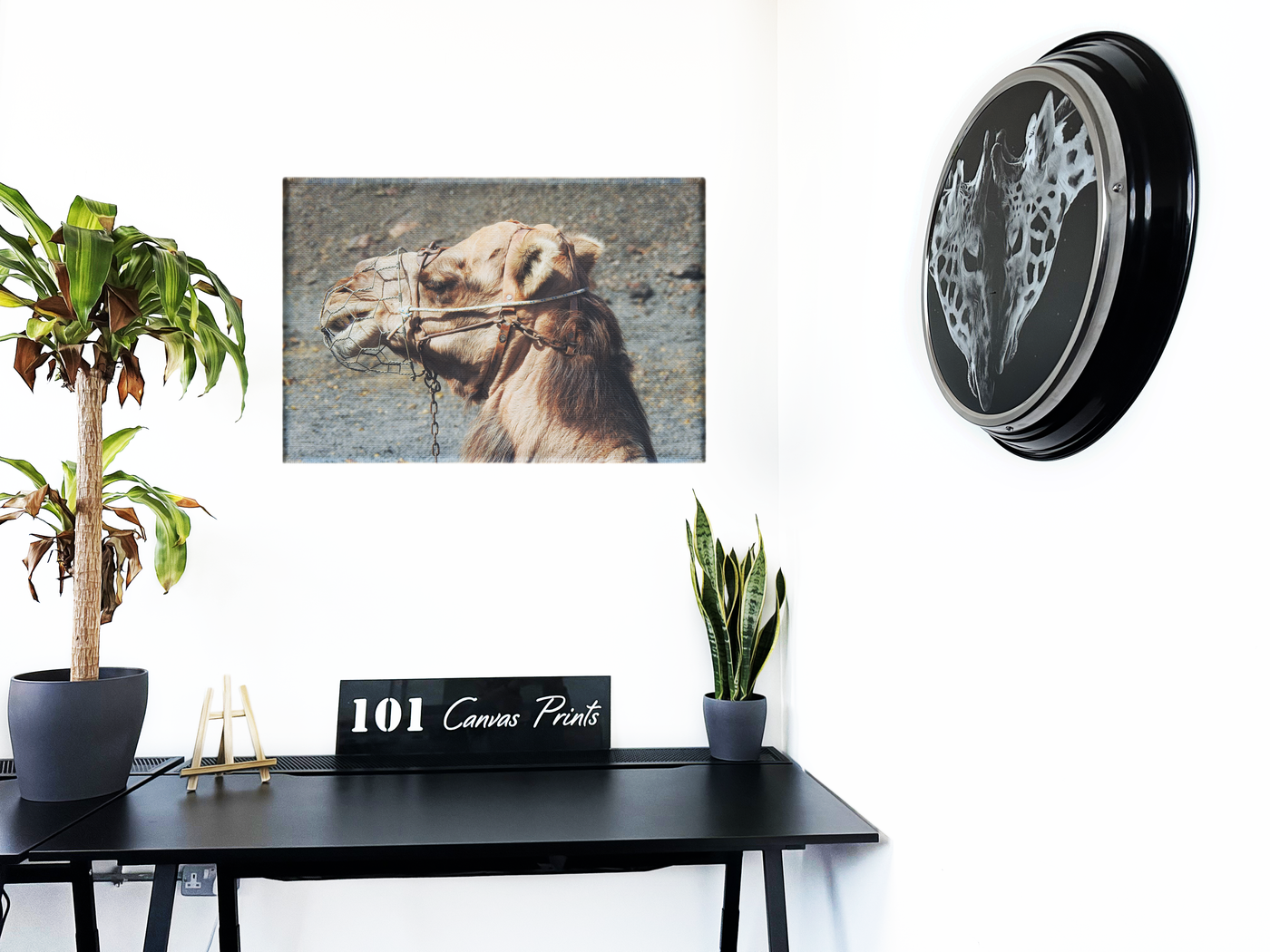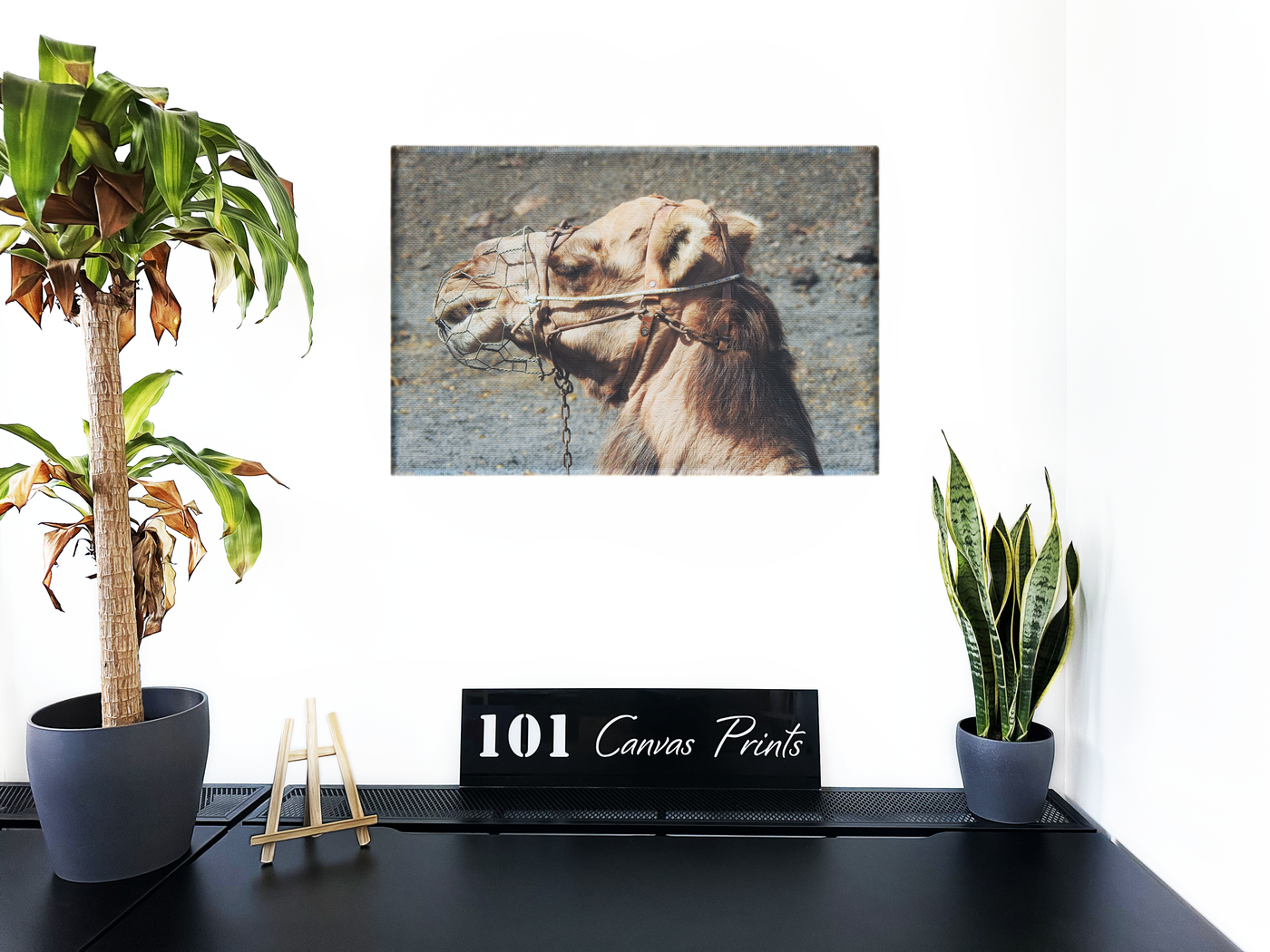 Rendered on Canvas, this image takes on a timeless quality. The natural texture of the Canvas enhances the photograph's organic feel, softening the details slightly to create a more painterly effect. This treatment adds depth to the image, particularly noticeable in the camel's fur and the interplay of light and shadow across its features.
