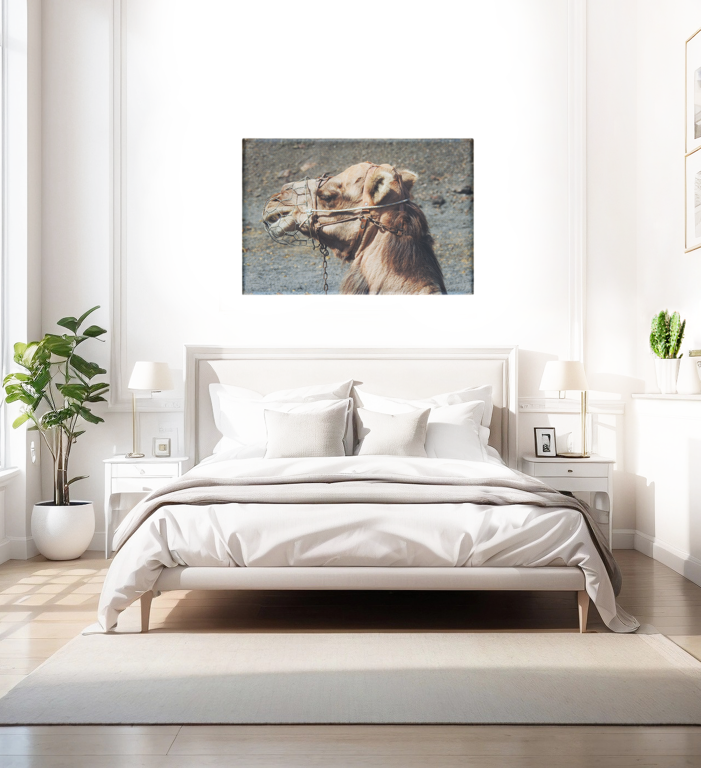 The camel's face, partially obscured by a wire muzzle, adds an element of intrigue to the composition whilst highlighting the animal's role as a beast of burden. Leather straps and metal fixtures of the harness create a striking contrast against the camel's soft, tawny fur, resulting in a compelling interplay of textures that the canvas medium beautifully accentuates.