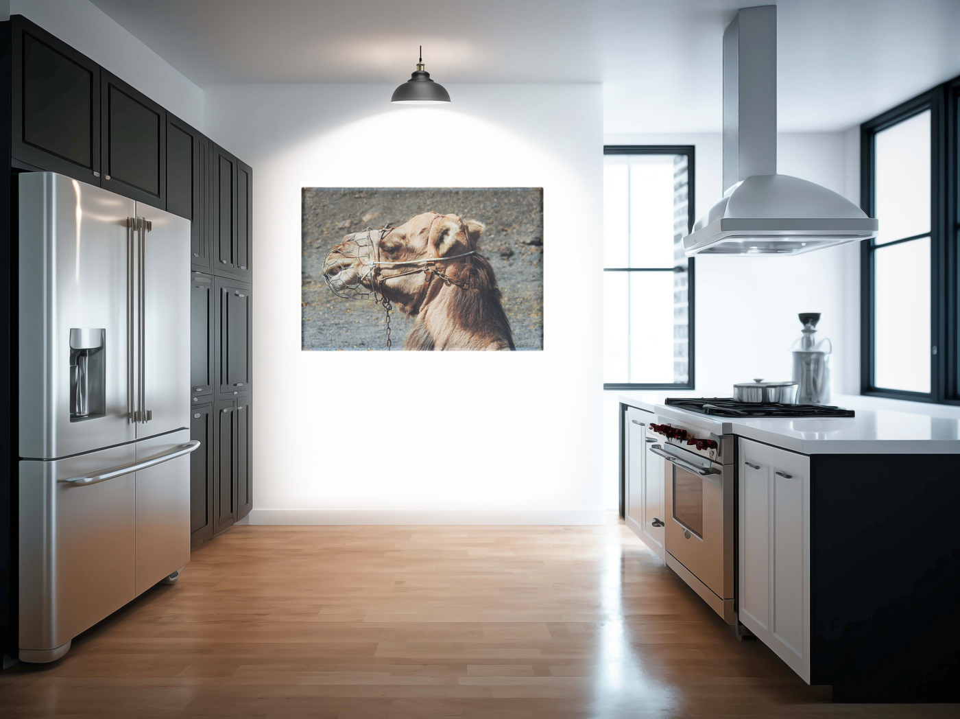 This captivating Canvas print brings the rugged beauty of a working camel to life, offering a close-up view that invites contemplation and admiration. The photograph focuses on the camel's head and upper body, revealing the intricate details of its harnessing and the rich textures of its fur.