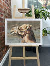 Rendered as an Fine Art print, this image takes on additional depth and vibrancy. The Fine Art paper finish enhances the rich colours and fine details, from the individual hairs on the camel's coat to the intricate patterns of the wire muzzle. The subtle reflections created by the textured surface add a dynamic element to the viewing experience, making the piece come alive in different lighting conditions.