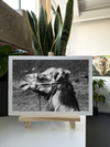 Rendered as an Monochrome Fine Art print, this image takes on additional depth and vibrancy. The Fine Art paper finish enhances the rich tonality and fine details, from the individual hairs on the camel's coat to the intricate patterns of the wire muzzle. The subtle reflections created by the textured surface add a dynamic element to the viewing experience, making the piece come alive in different lighting conditions.