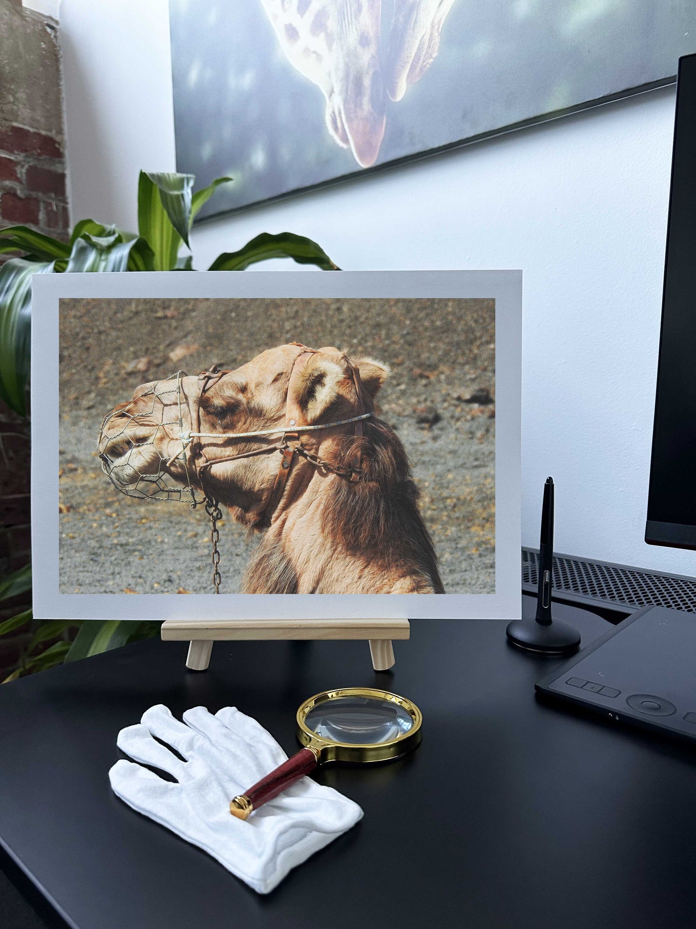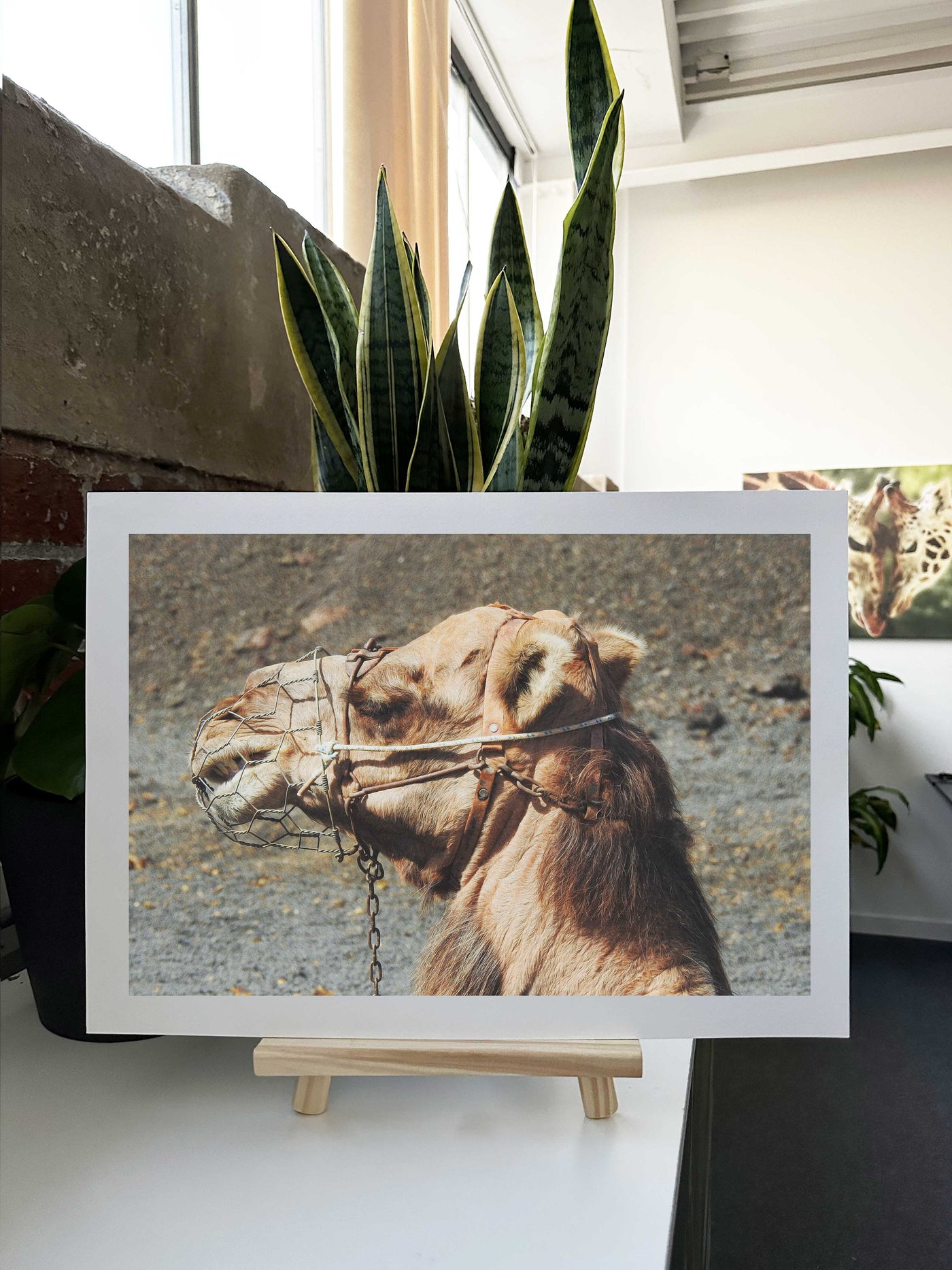 Rendered as an Fine Art print, this image takes on additional depth and vibrancy. The Fine Art paper finish enhances the rich colours and fine details, from the individual hairs on the camel's coat to the intricate patterns of the wire muzzle. The subtle reflections created by the textured surface add a dynamic element to the viewing experience, making the piece come alive in different lighting conditions.