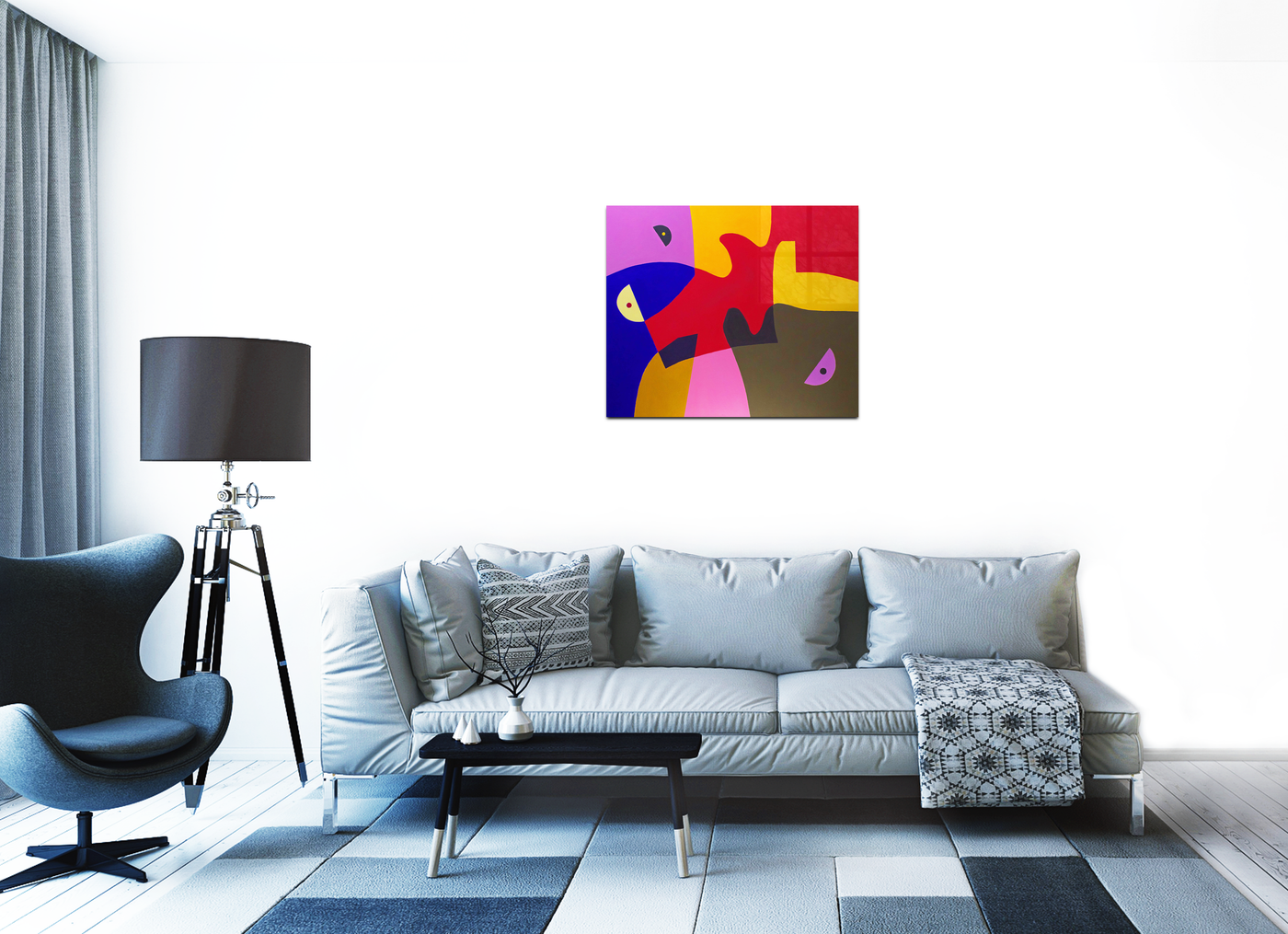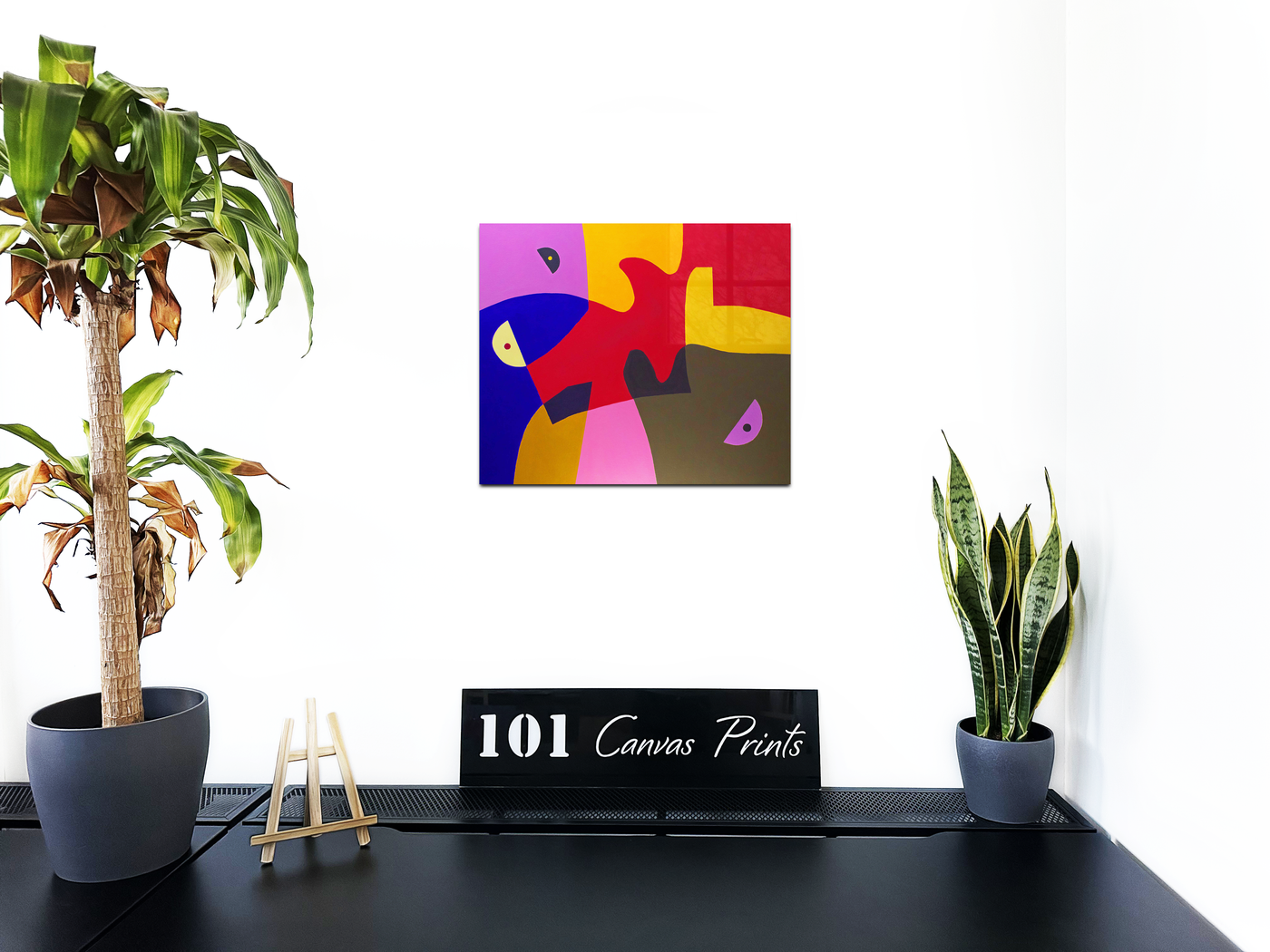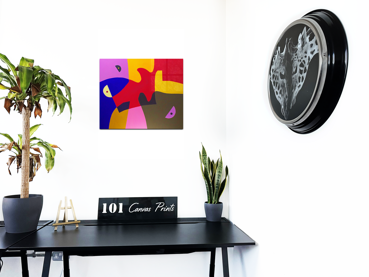 Rendered in our premium Acrylic medium, this artwork achieves an extraordinary level of visual impact. The high-gloss finish dramatically enhances the intensity of the colours, making them appear to glow from within, while the crystal-clear surface creates an almost three-dimensional effect that brings new life to the flat colour fields. The way light interacts with our Acrylic prints adds an extra dimension to the viewing experience, with different angles revealing new aspects of the colour relationships. This piece would make a stunning statement in any contemporary setting, from a modern art gallery to a design-conscious home office, where its bold colours and clean lines can create maximum visual impact.