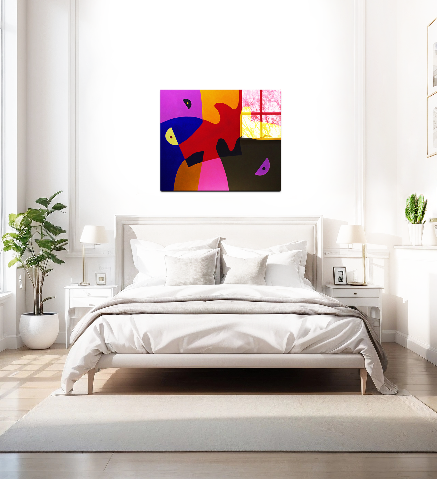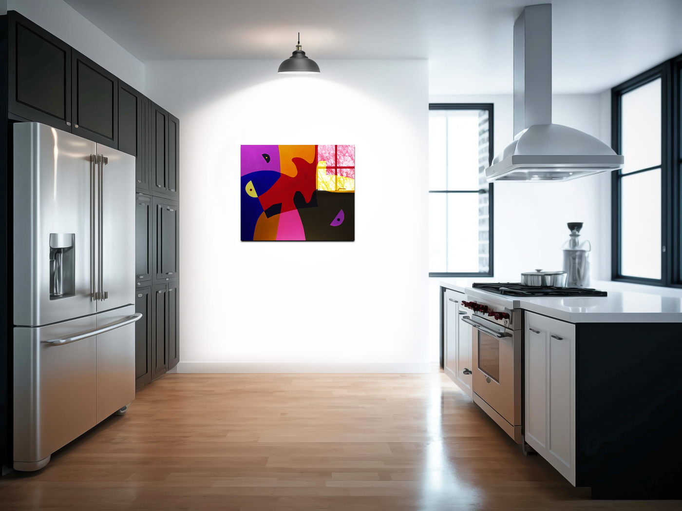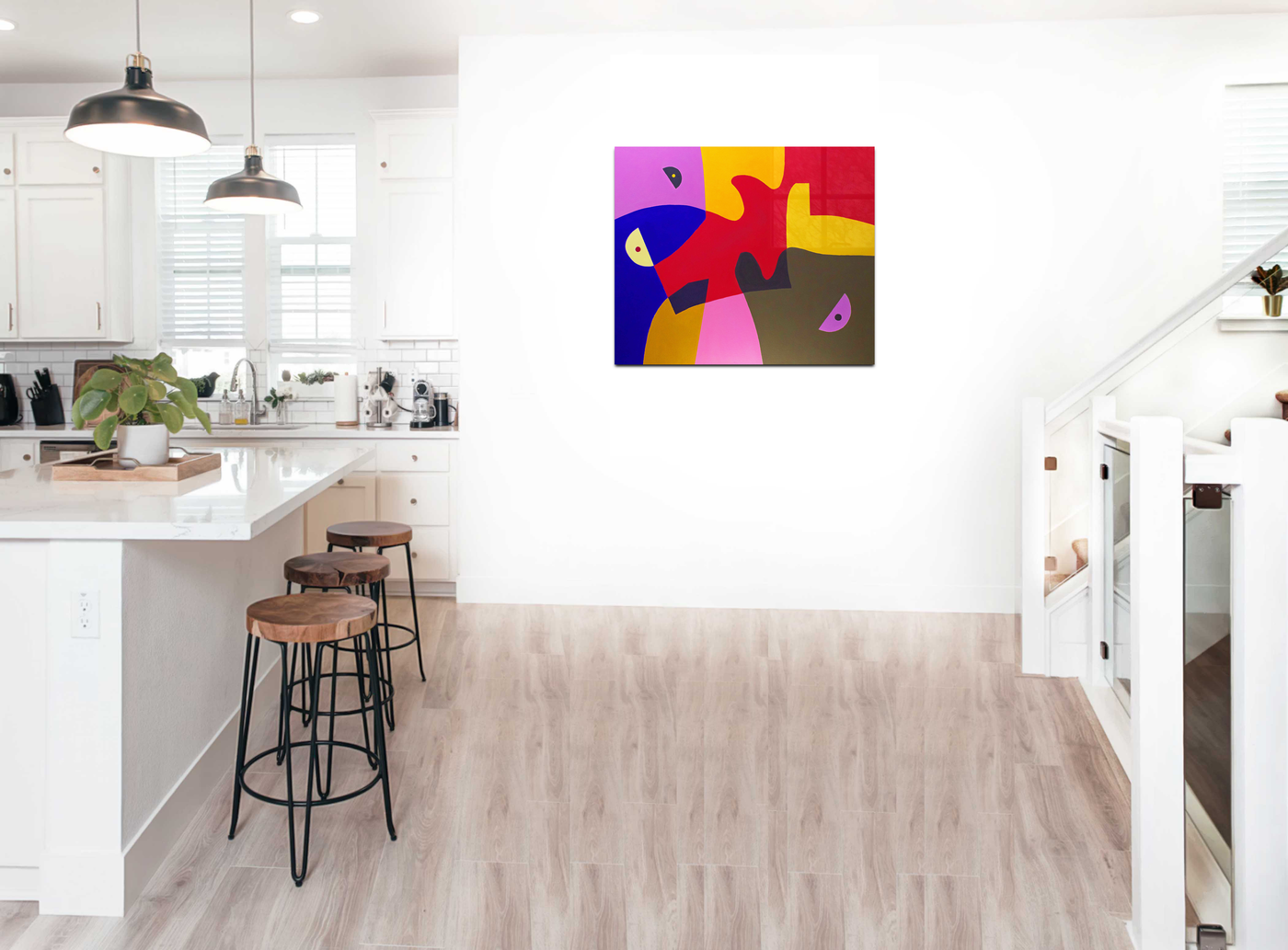 Rendered in our premium Acrylic medium, this artwork achieves an extraordinary level of visual impact. The high-gloss finish dramatically enhances the intensity of the colours, making them appear to glow from within, while the crystal-clear surface creates an almost three-dimensional effect that brings new life to the flat colour fields. The way light interacts with our Acrylic prints adds an extra dimension to the viewing experience, with different angles revealing new aspects of the colour relationships. This piece would make a stunning statement in any contemporary setting, from a modern art gallery to a design-conscious home office, where its bold colours and clean lines can create maximum visual impact.