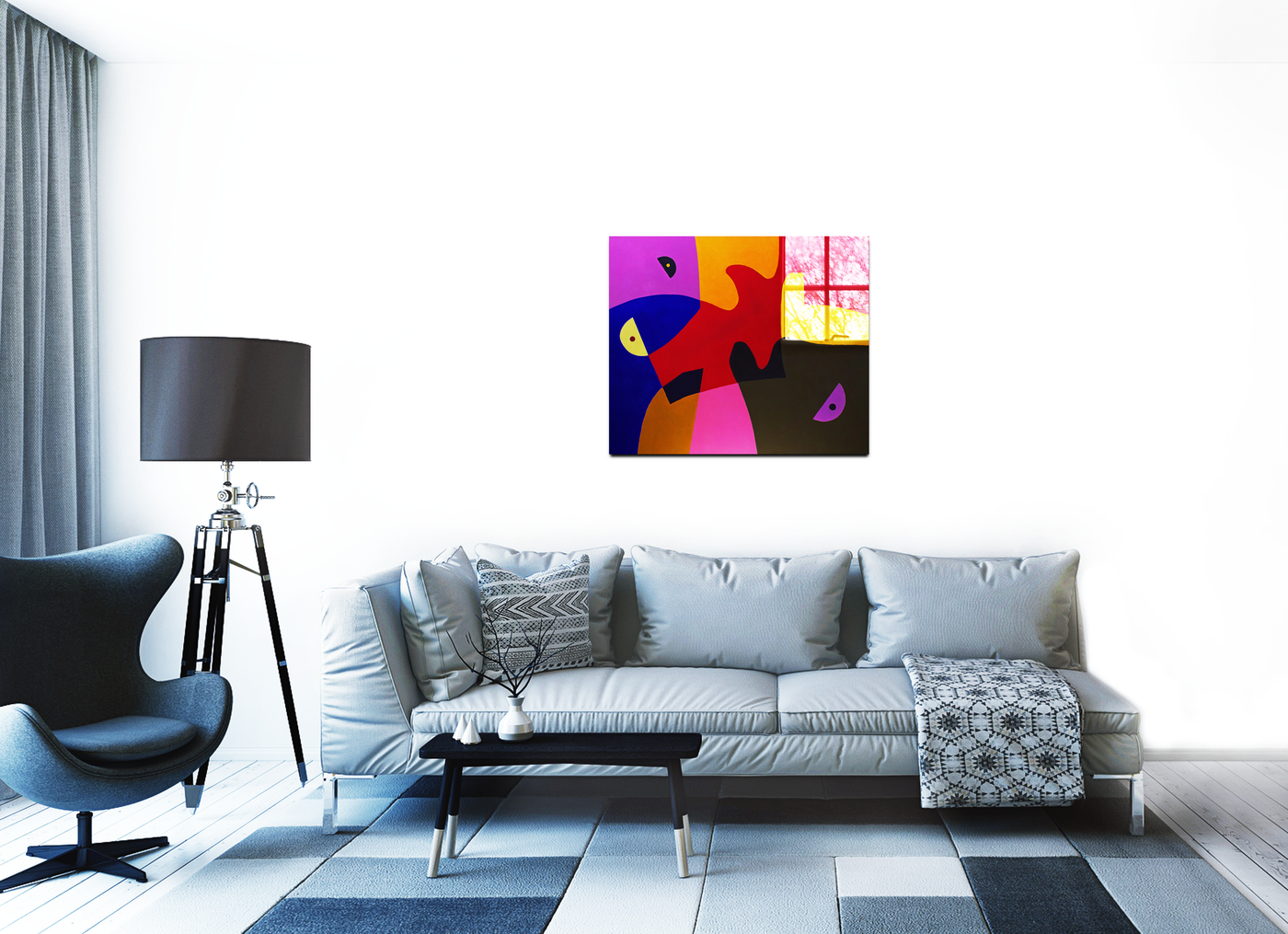 This compelling Abstract work, meticulously reproduced by the 101 Canvas Prints team, presents a masterclass in colour blocking and compositional balance. The artwork creates an engaging visual narrative through its use of interlocking shapes and forms, with carefully placed circular elements that seem to peer out at the viewer, adding an element of personality to the geometric abstraction. The composition achieves a perfect balance between playful energy and sophisticated design.
