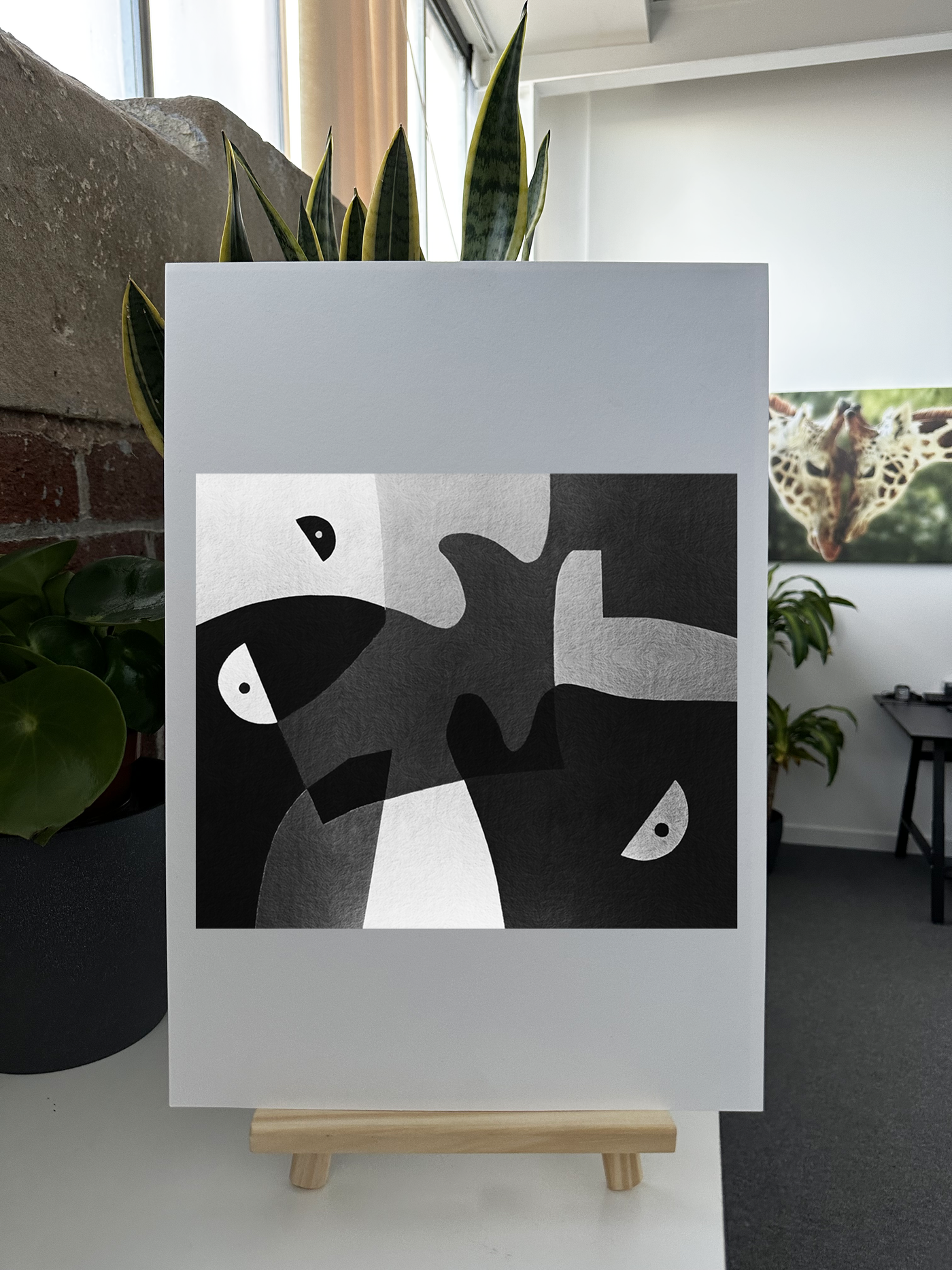 When reproduced on our premium Fine Art paper material, this piece takes on an additional layer of artistic refinement. The natural, matte finish of the Fine Art paper softens the bold Monochrome tones just enough to make them perfectly suited to any contemporary space, while maintaining their vibrancy and impact. The texture of the Fine Art paper adds a subtle dimension to the flat gradient fields, creating an interesting interplay between smooth design and organic material. This piece would make a striking focal point in a modern living room, creative office space, or any area where its playful sophistication can be fully appreciated.