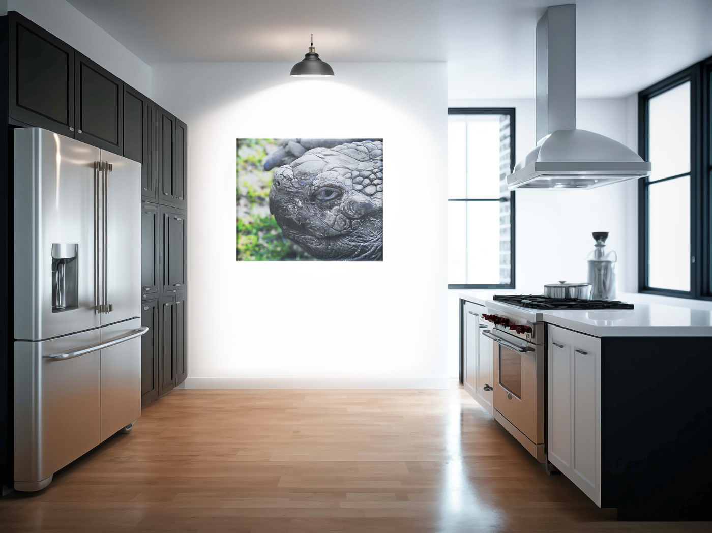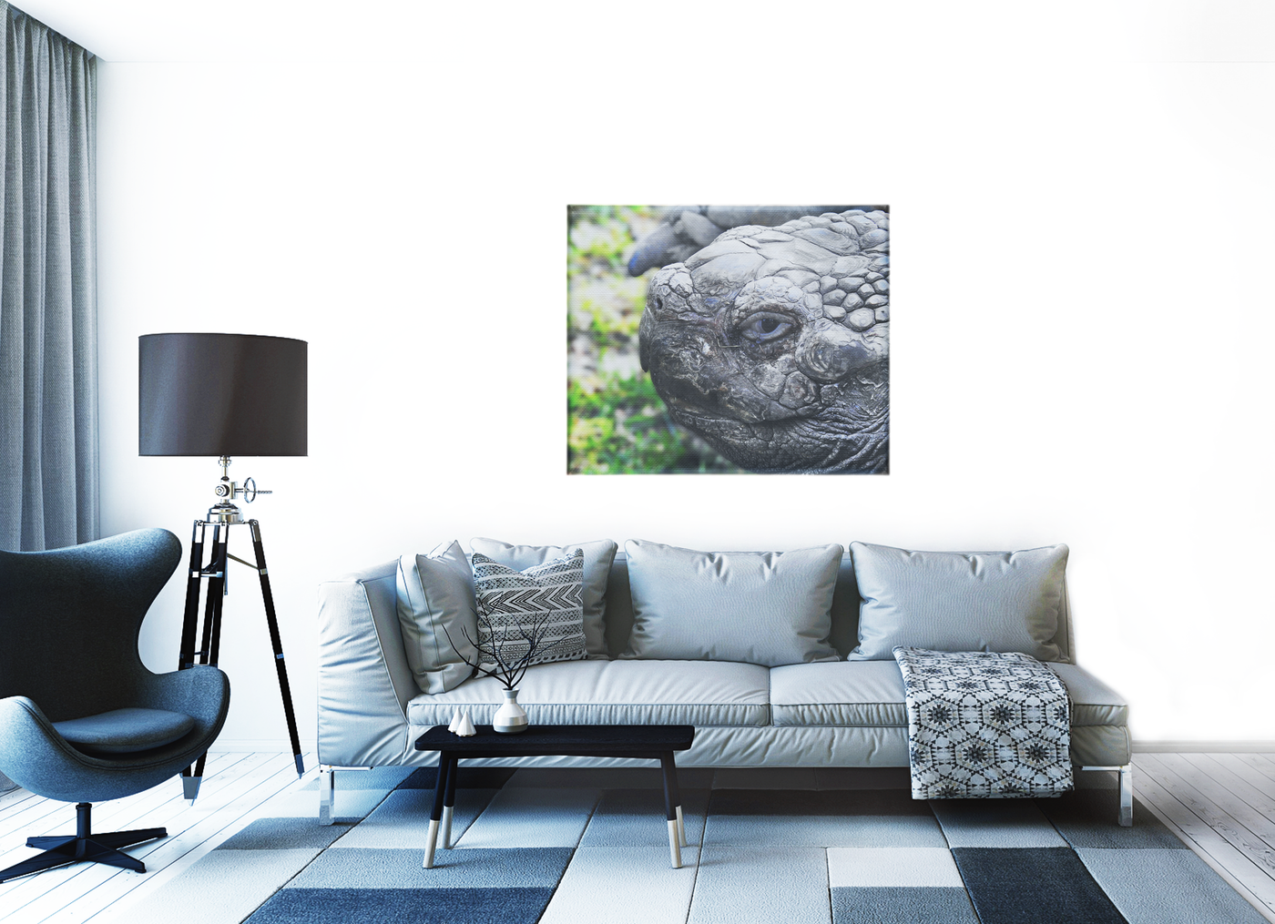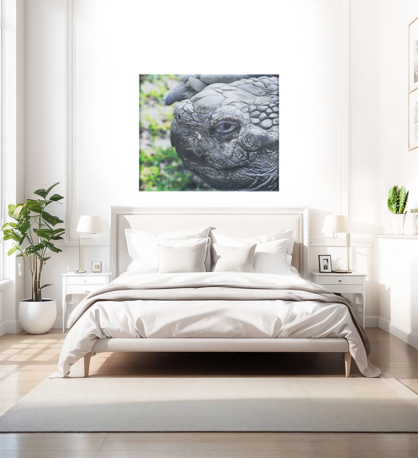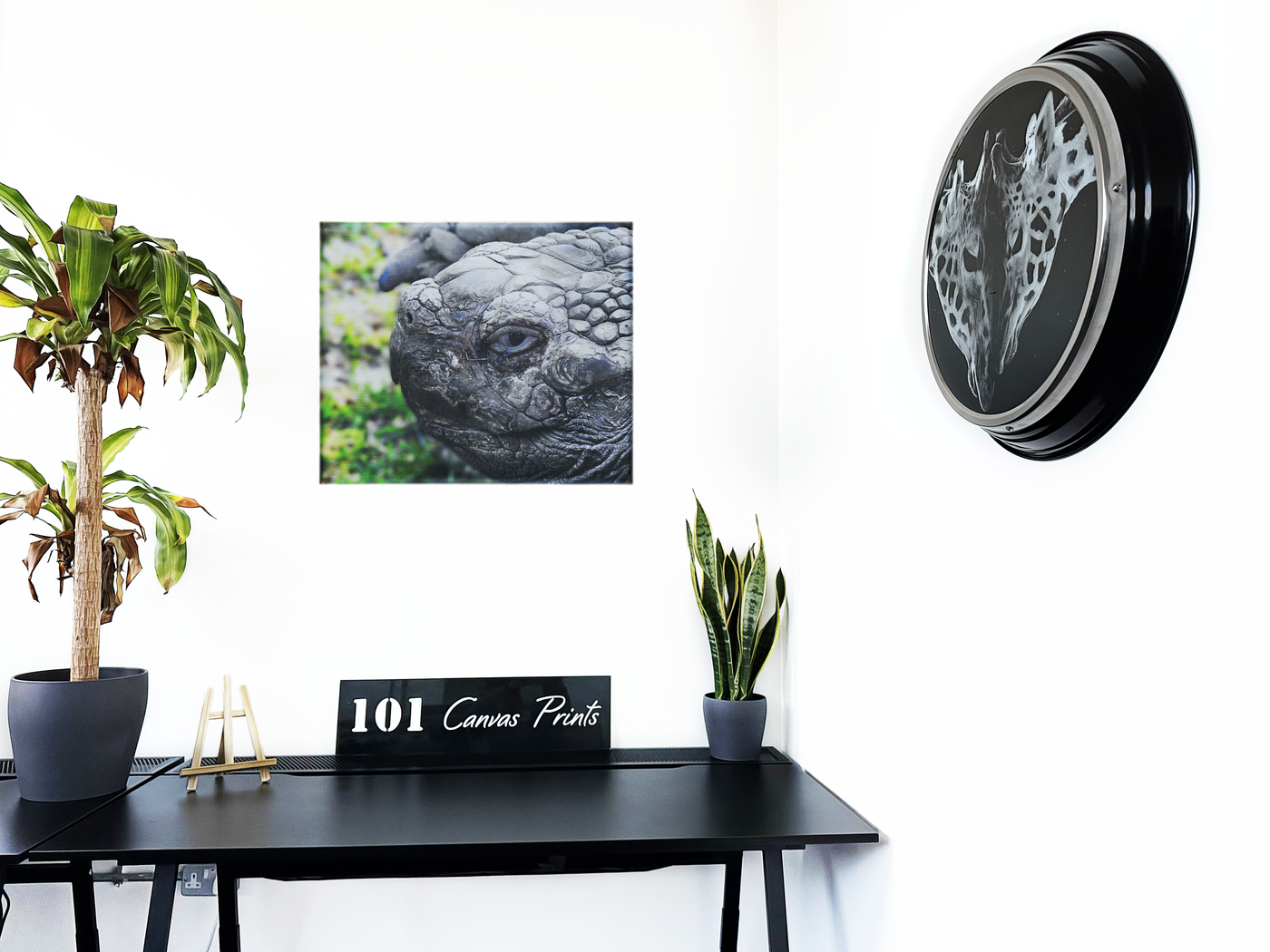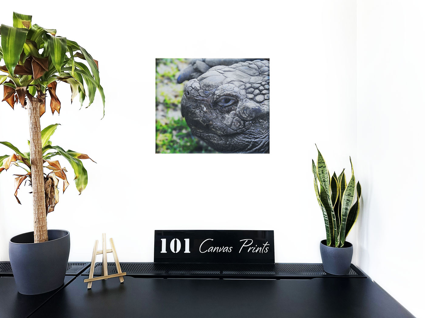 Rendered on Canvas, the natural texture of the fabric enhances the organic quality of the image, perfectly complementing the tortoise's rugged features. The matte finish of the Canvas softens the contrasts slightly, creating a timeless, almost painterly effect that accentuates the tortoise's ancient quality and the nuanced interplay of light across its features.