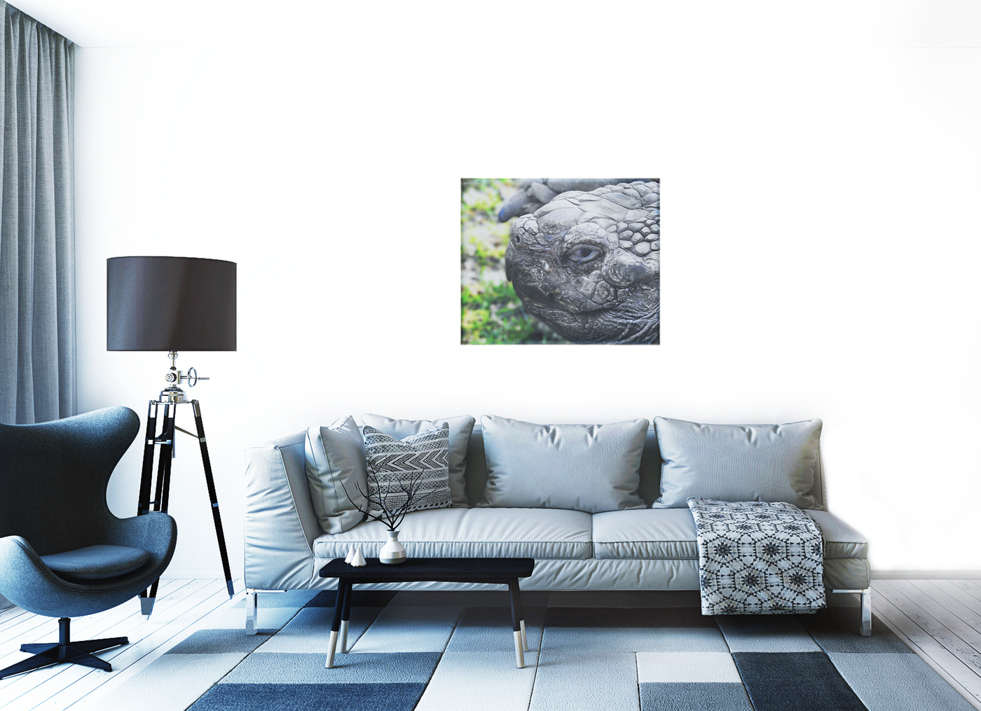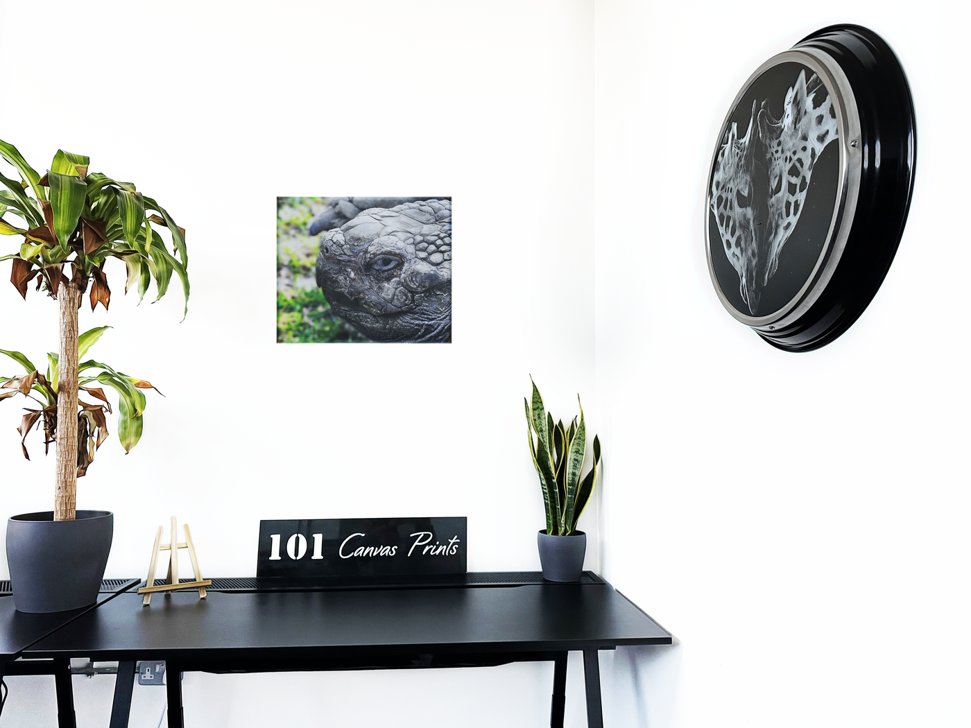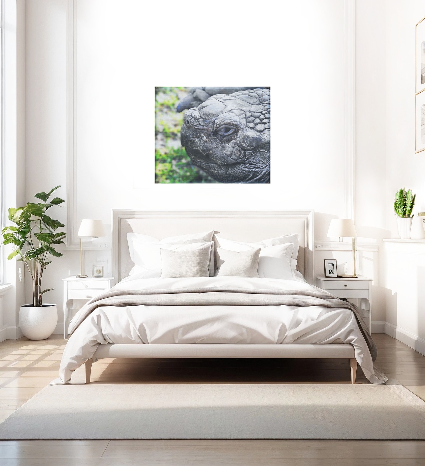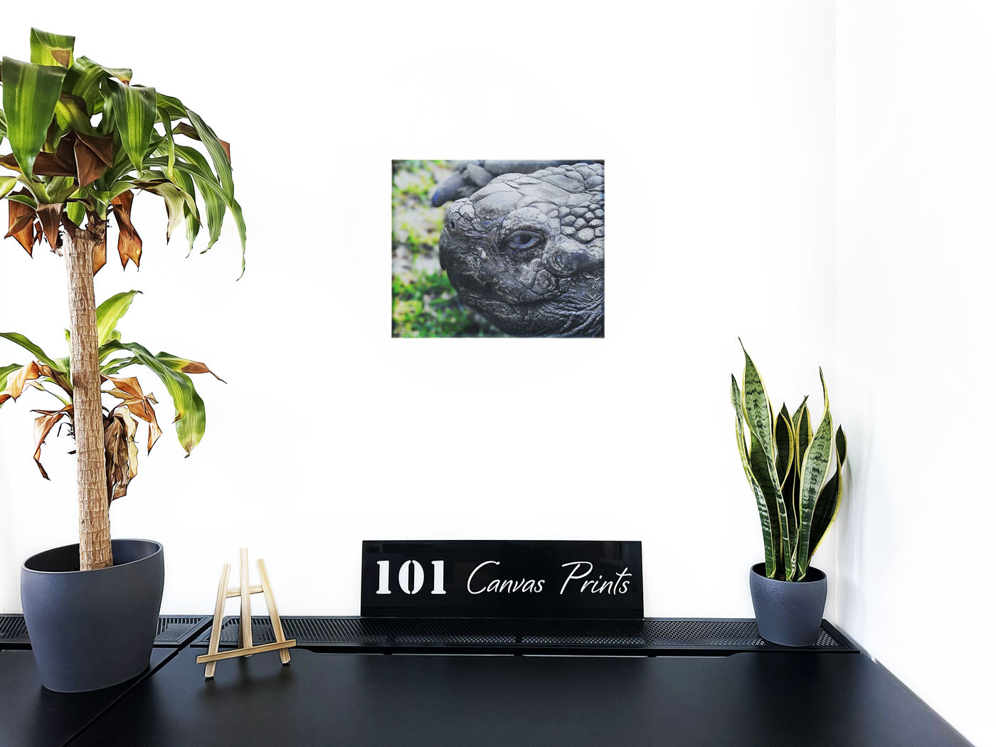 Rendered on Canvas, the natural texture of the fabric enhances the organic quality of the image, perfectly complementing the tortoise's rugged features. The matte finish of the Canvas softens the contrasts slightly, creating a timeless, almost painterly effect that accentuates the tortoise's ancient quality and the nuanced interplay of light across its features.