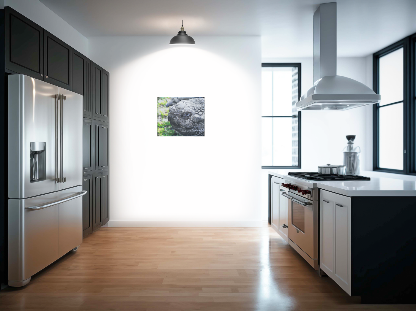 Rendered on Canvas, the natural texture of the fabric enhances the organic quality of the image, perfectly complementing the tortoise's rugged features. The matte finish of the Canvas softens the contrasts slightly, creating a timeless, almost painterly effect that accentuates the tortoise's ancient quality and the nuanced interplay of light across its features.