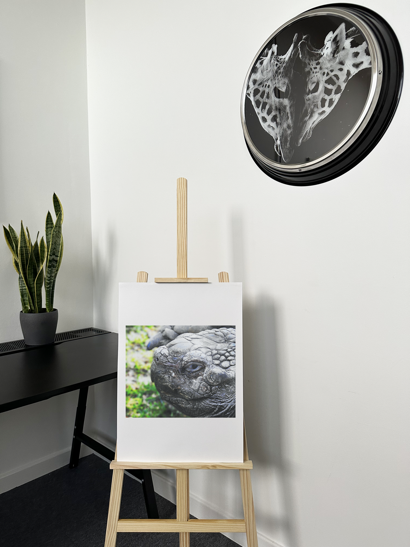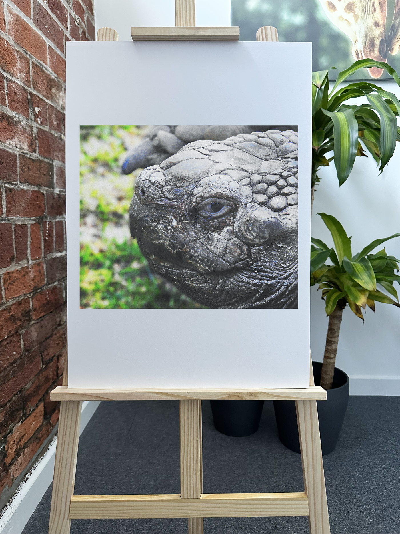 Rendered on Fine Art paper, the natural texture of the fabric enhances the organic quality of the image, perfectly complementing the tortoise's rugged features. The matte finish of the Fine Art paper softens the contrasts slightly, creating a timeless, almost painterly effect that accentuates the tortoise's ancient quality and the nuanced interplay of light across its features.
