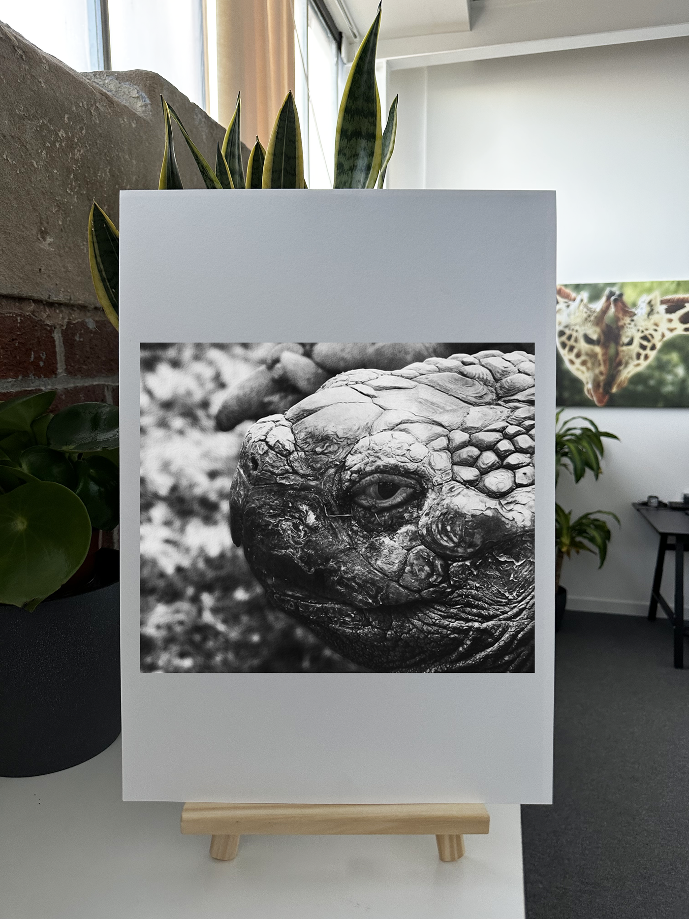 Rendered on Fine Art paper, the natural texture of the fabric enhances the organic quality of the image, perfectly complementing the tortoise's rugged features. The matte finish of the Fine Art paper softens the contrasts slightly, creating a timeless, almost painterly effect that accentuates the tortoise's ancient quality and the nuanced interplay of light across its features.