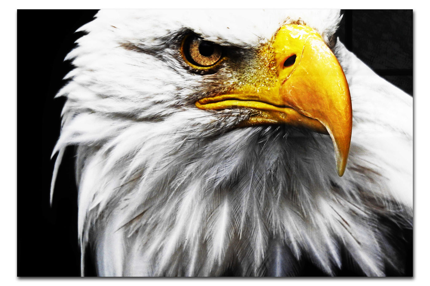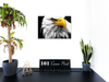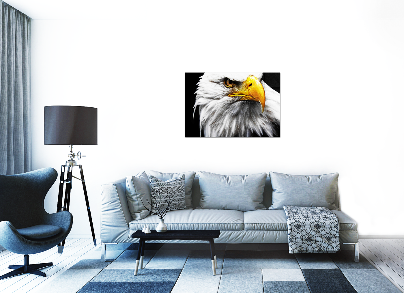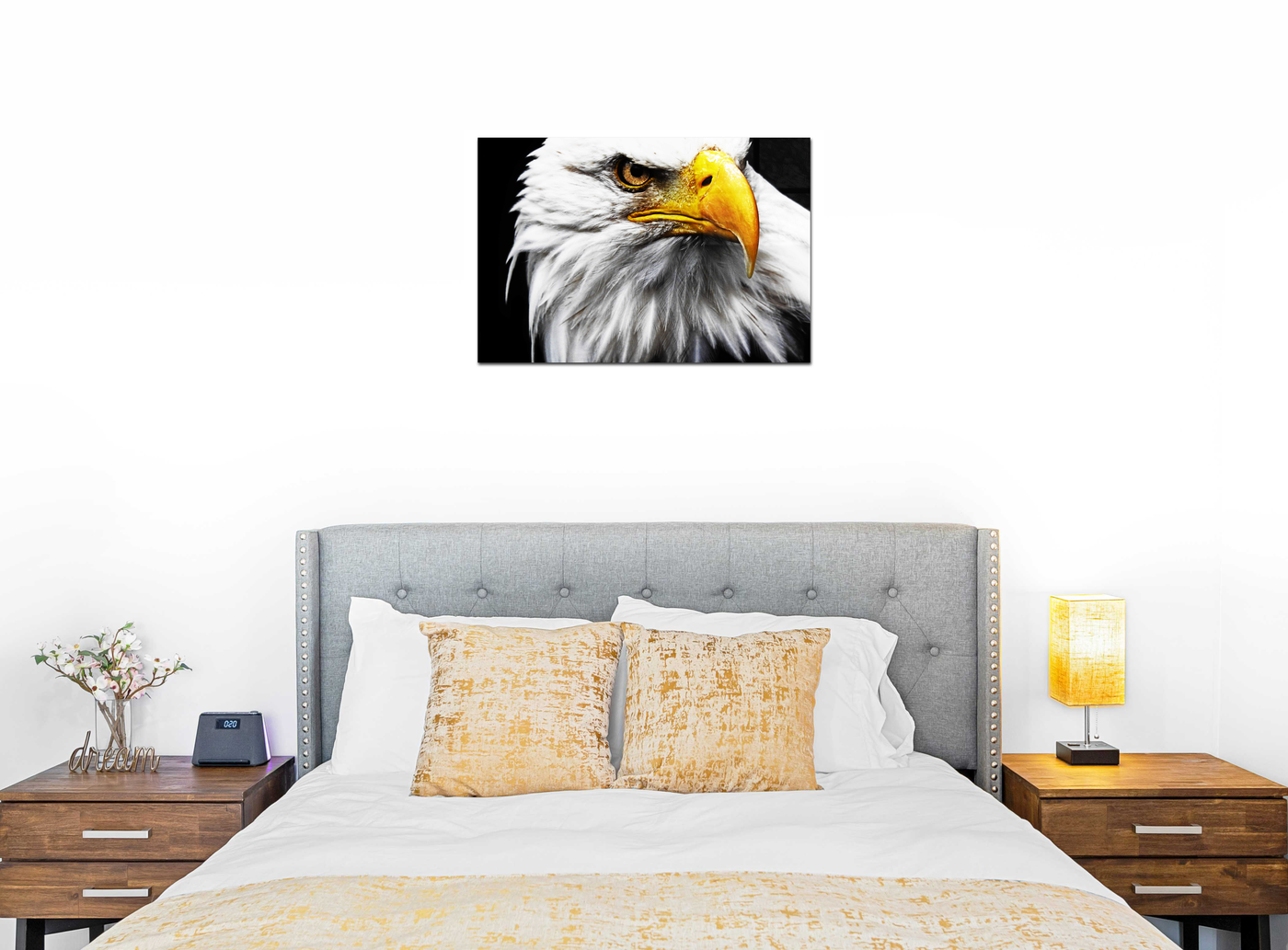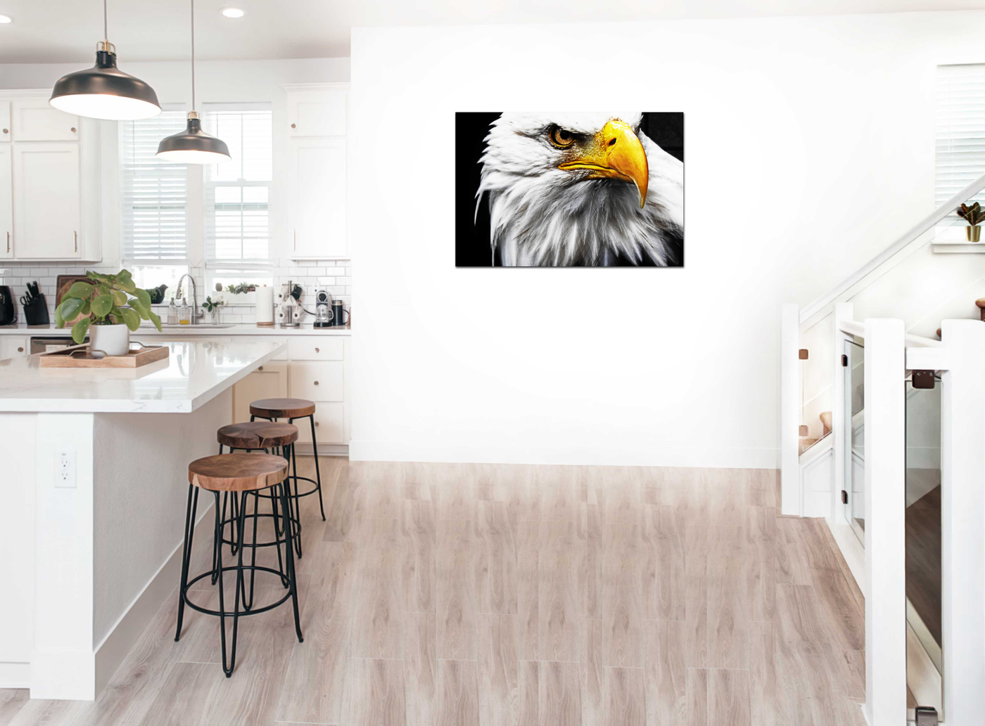 This powerful portrait showcases the Bald Eagle's unwavering focus and regal demeanour. The bird's sharp eye, captured in stunning detail, seems to follow you across the room, creating an engaging and dynamic viewing experience that will captivate guests and family members alike.