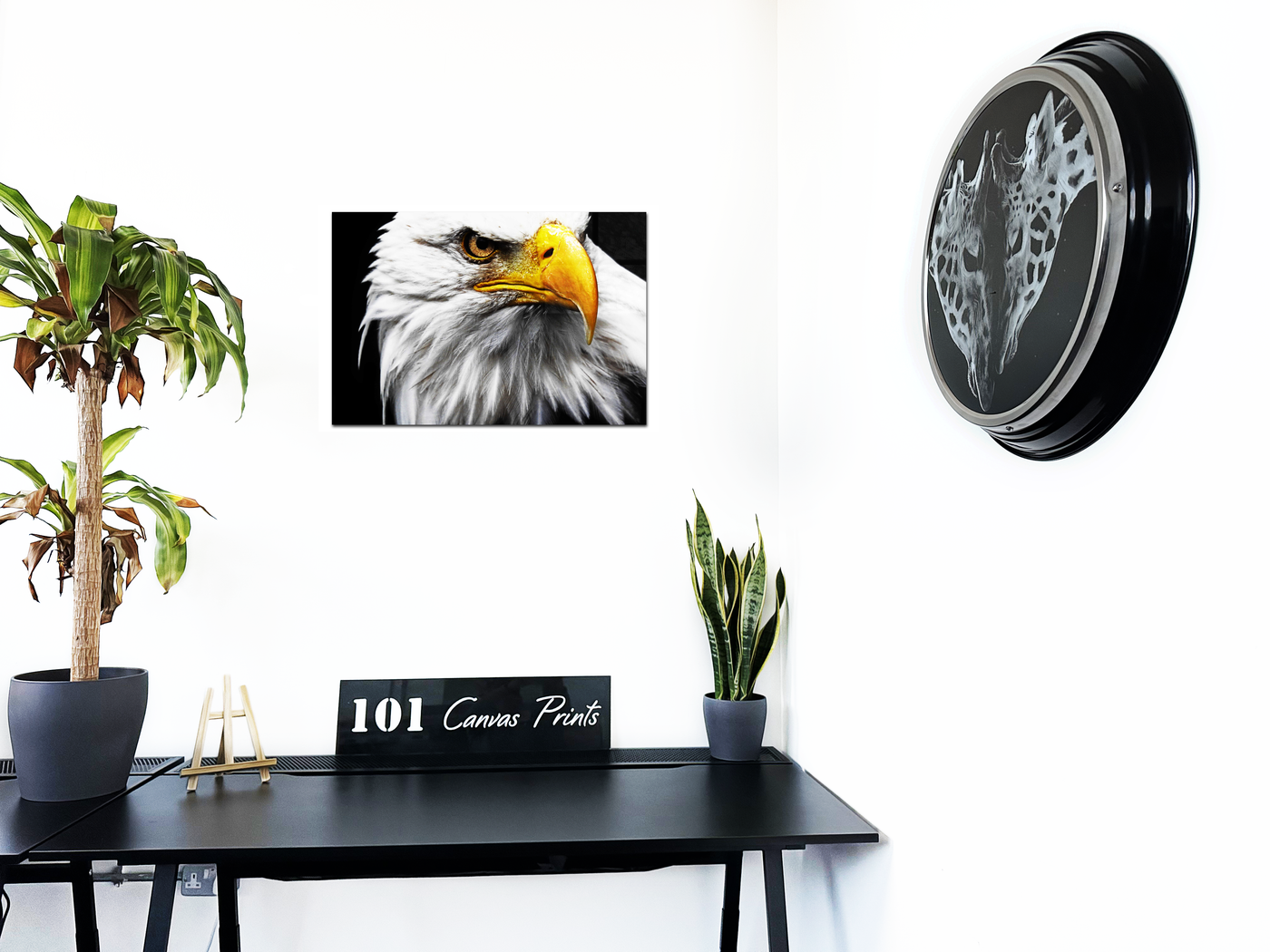 Capture the fierce majesty of America's national bird with this breath taking close-up of a Bald Eagle, expertly photographed by the 101 Canvas Prints team. The striking detail of this Acrylic print brings the eagle's penetrating gaze and distinctive features to life, creating an arresting focal point for any room.