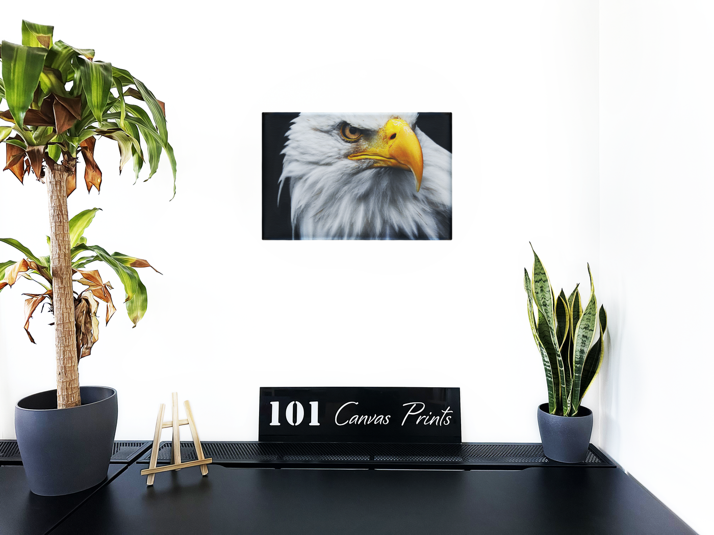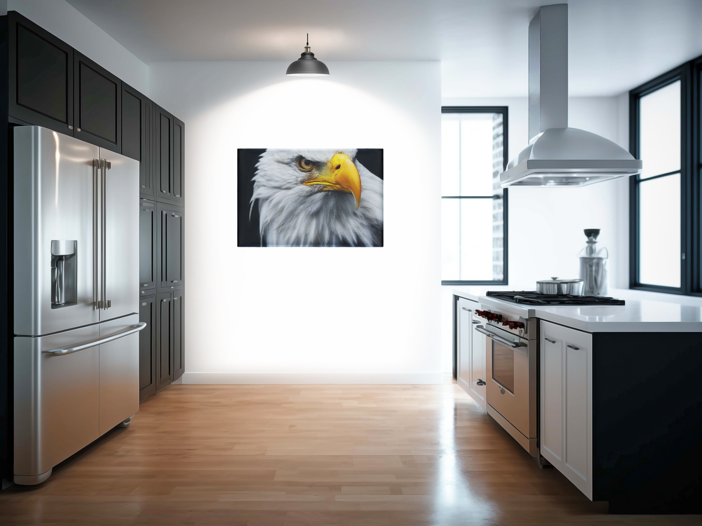 This Canvas print arrives expertly stretched and ready to grace your walls. Whether placed in a cosy den, a professional office, or as the centrepiece of your living room, this captivating bald eagle portrait adds a touch of wilderness and wonder to any interior, serving as a daily reminder of nature's magnificent artistry.