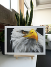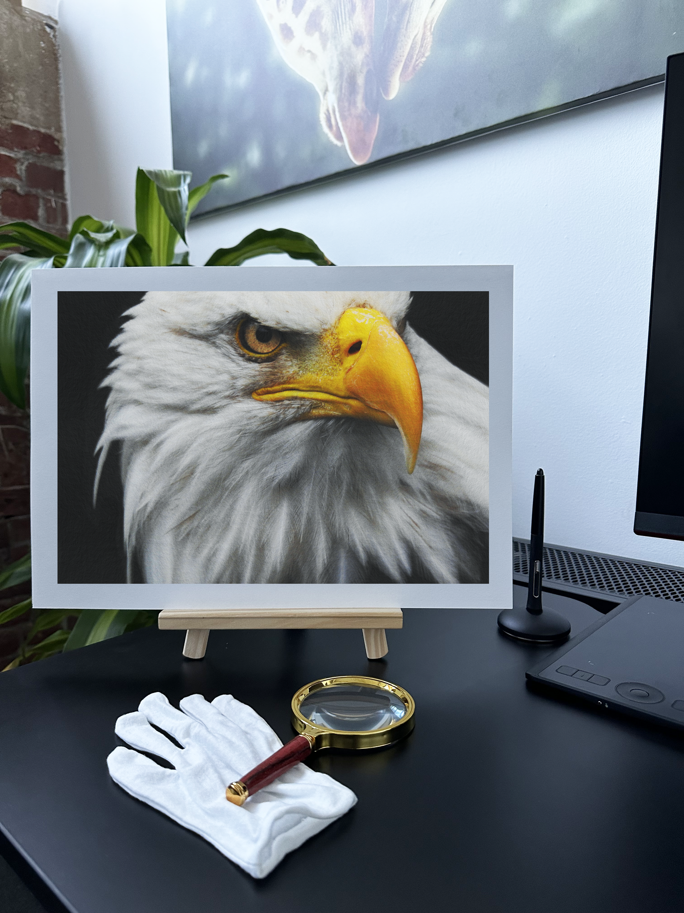 Our state-of-the-art Fine Art printing process enhances the photograph's natural vibrancy, emphasising the contrast between the eagle's snow-white head feathers and its golden beak and eye. The textured finish of the Fine Art paper adds depth and dimensionality, making the image appear almost three-dimensional.