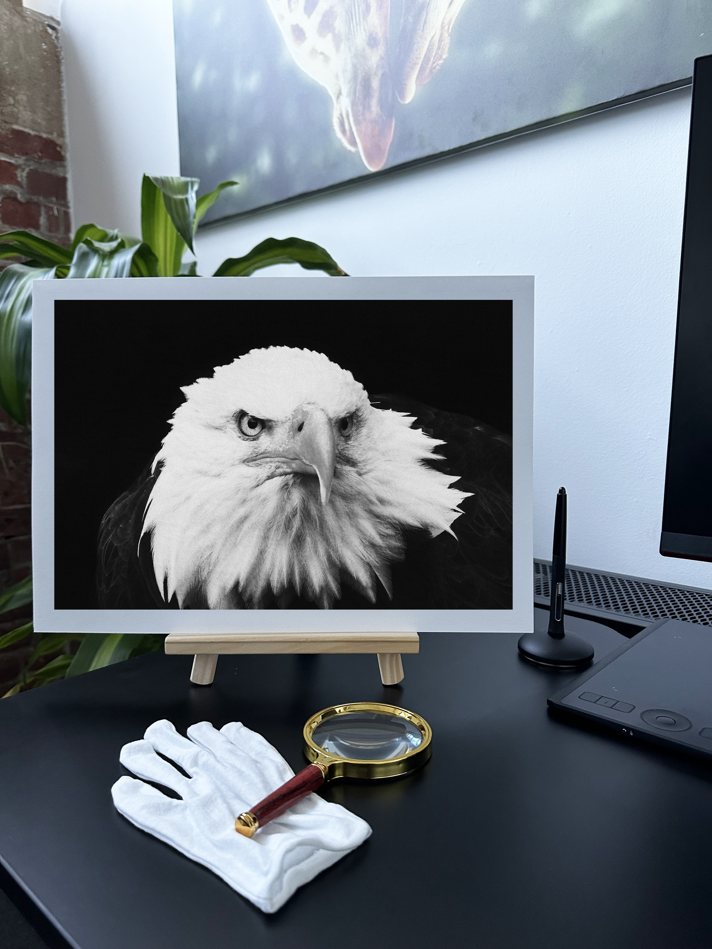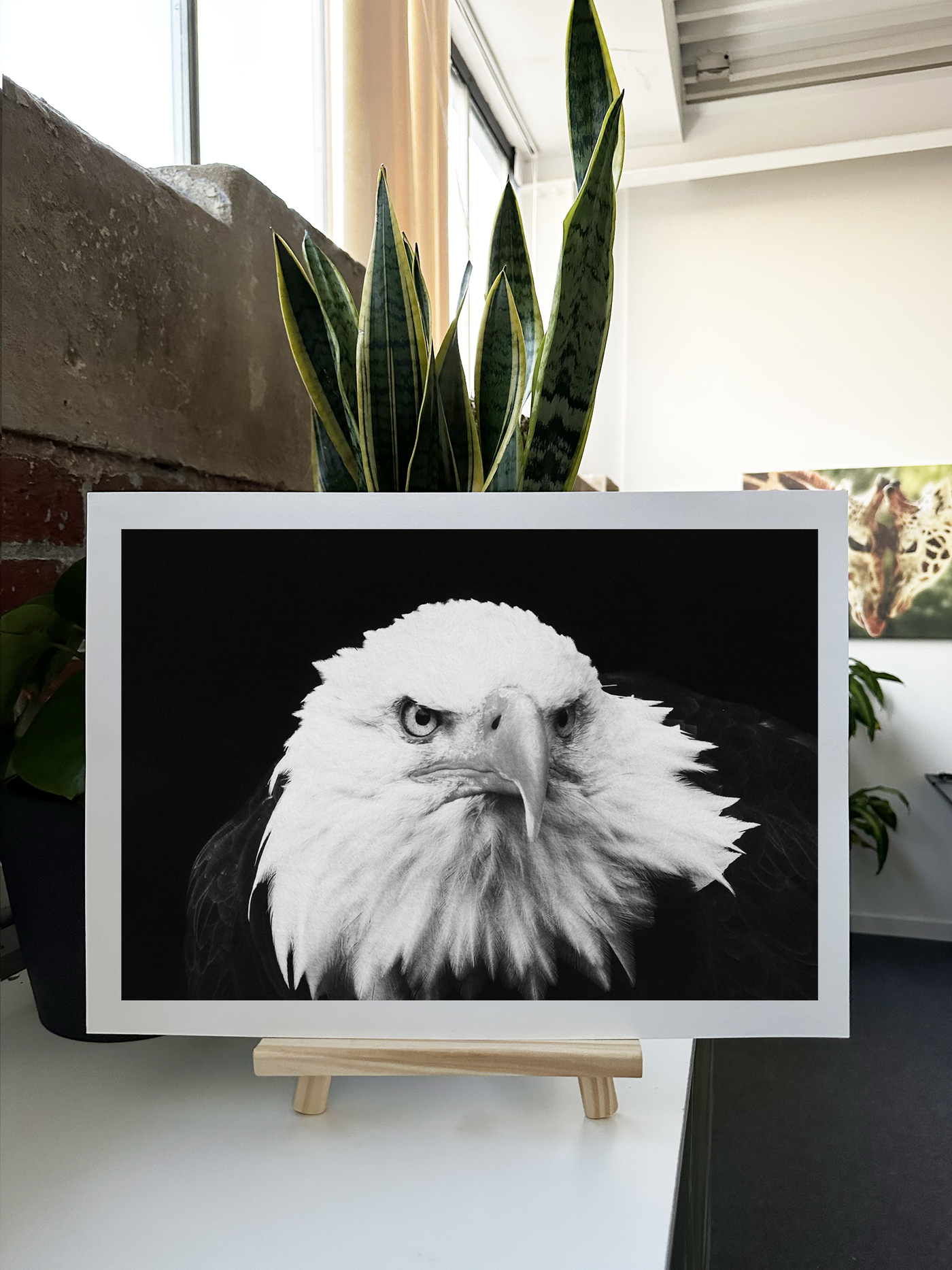 Our advanced printing techniques ensure that every nuance of this magnificent bird is reproduced with exceptional detail on the Fine Art paper. From the subtle variations in its plumage to the determined set of its gaze, this print brings the raw beauty of nature into sharp focus, allowing you to appreciate the bald eagle's grandeur up close.