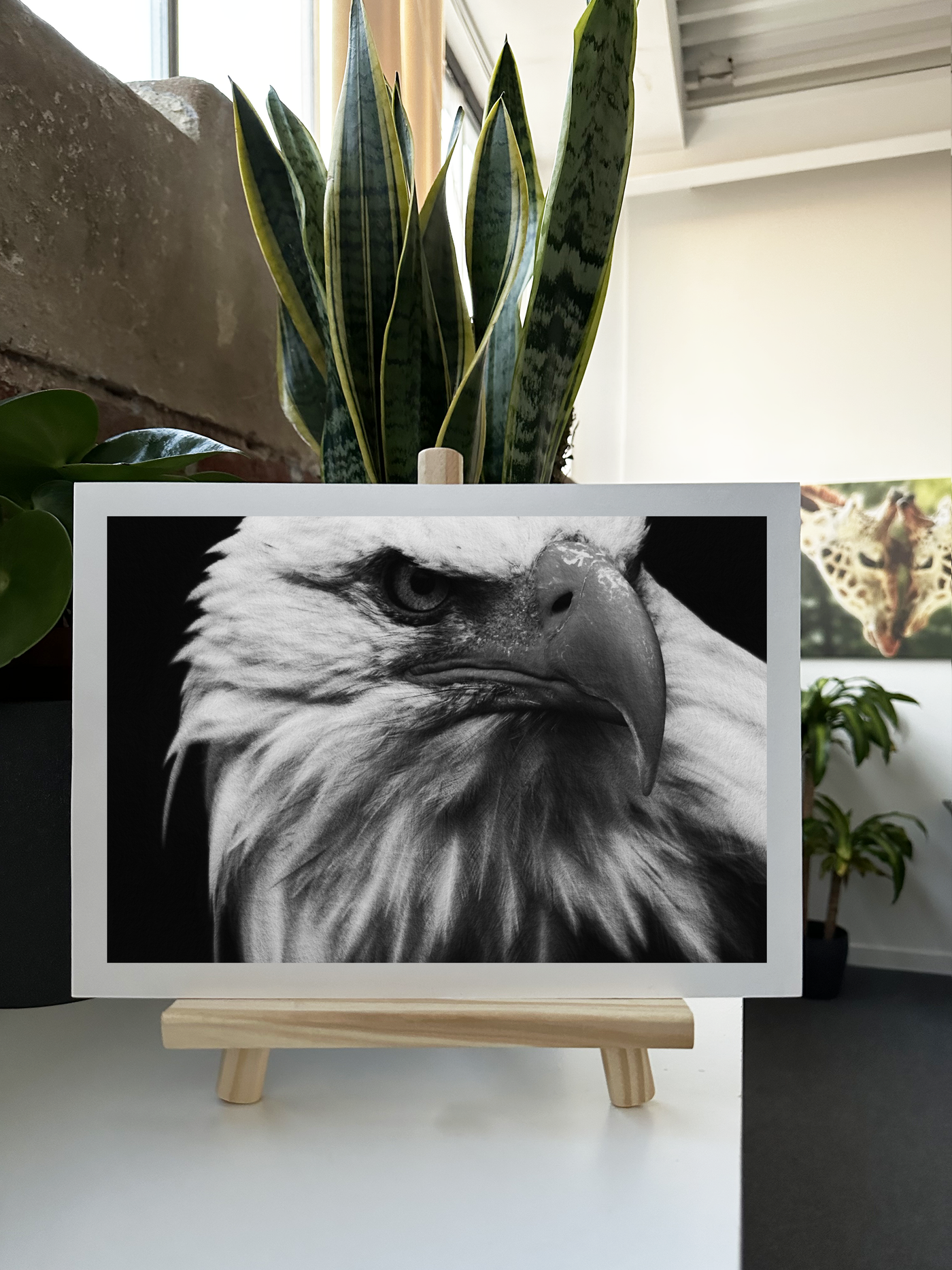Our state-of-the-art Fine Art printing process enhances the photograph's natural vibrancy, emphasising the contrast between the eagle's snow-white head feathers and its Monochrome beak and eye. The textured finish of the Fine Art paper adds depth and dimensionality, making the image appear almost three-dimensional.