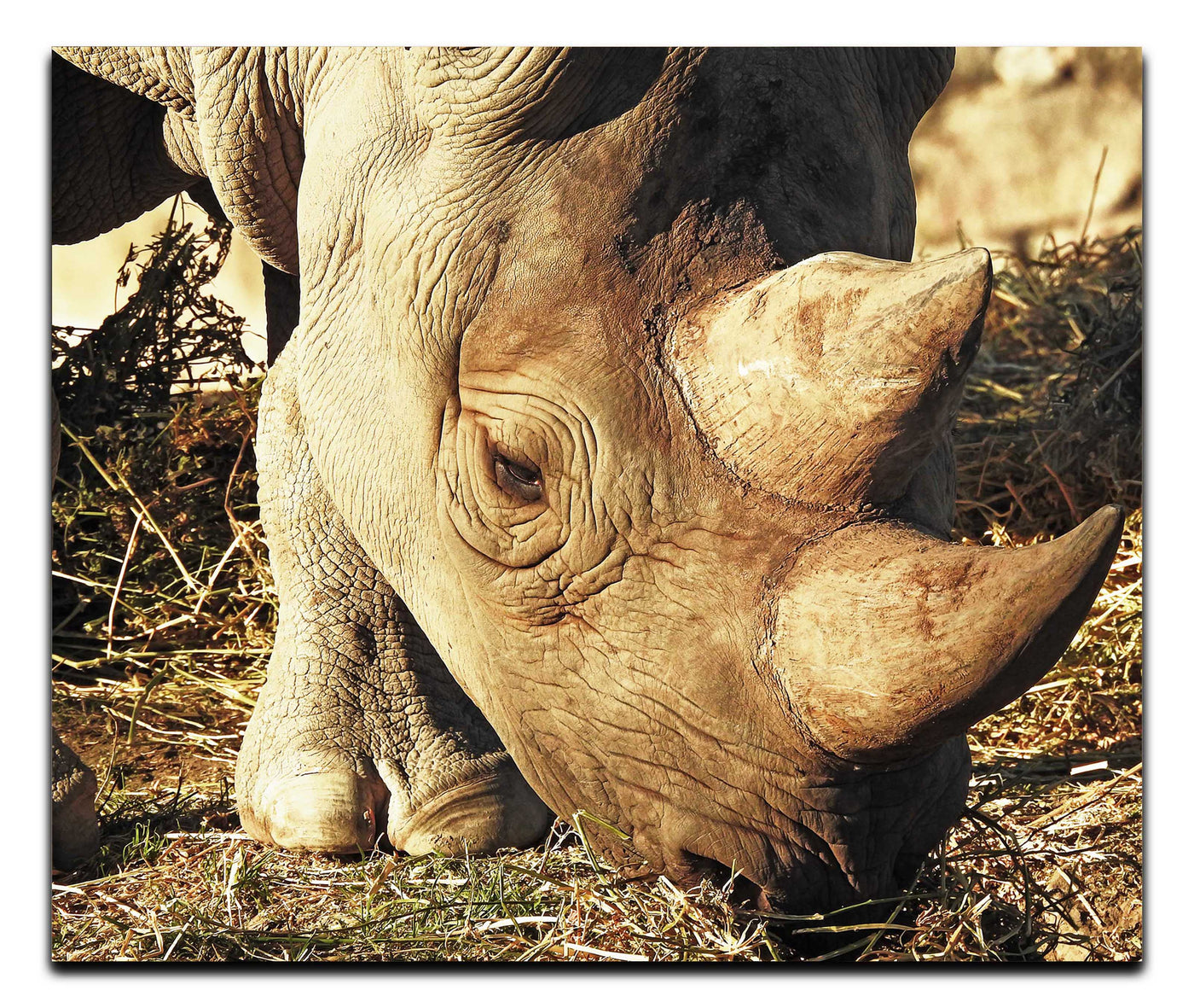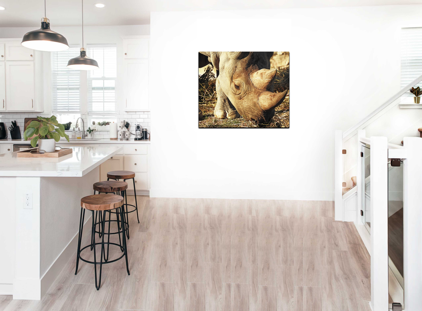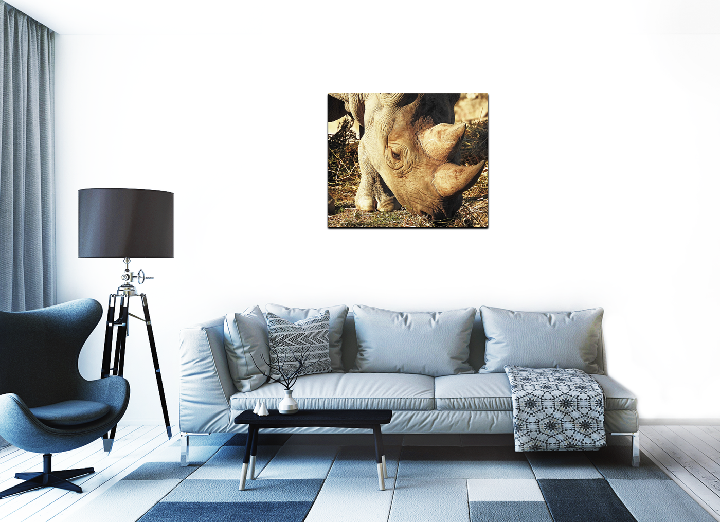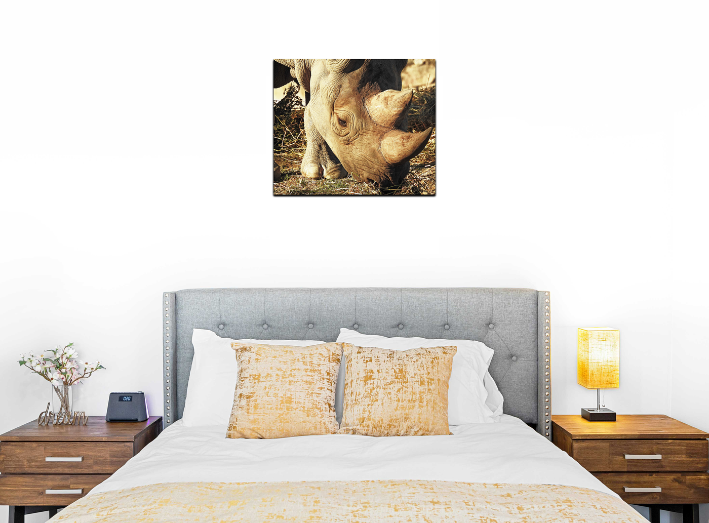 The photographer's mastery of light brings out an extraordinary range of textures and tones within the rhino's skin, from smooth, pale areas to deeply textured folds that resemble weathered leather. Through our precise photography and print enhancement process, we've maintained every nuance of detail and tone, ensuring that the full complexity of the subject is preserved with perfect clarity. The result is an image that serves both as a striking piece of art and a powerful reminder of the beauty of wildlife.