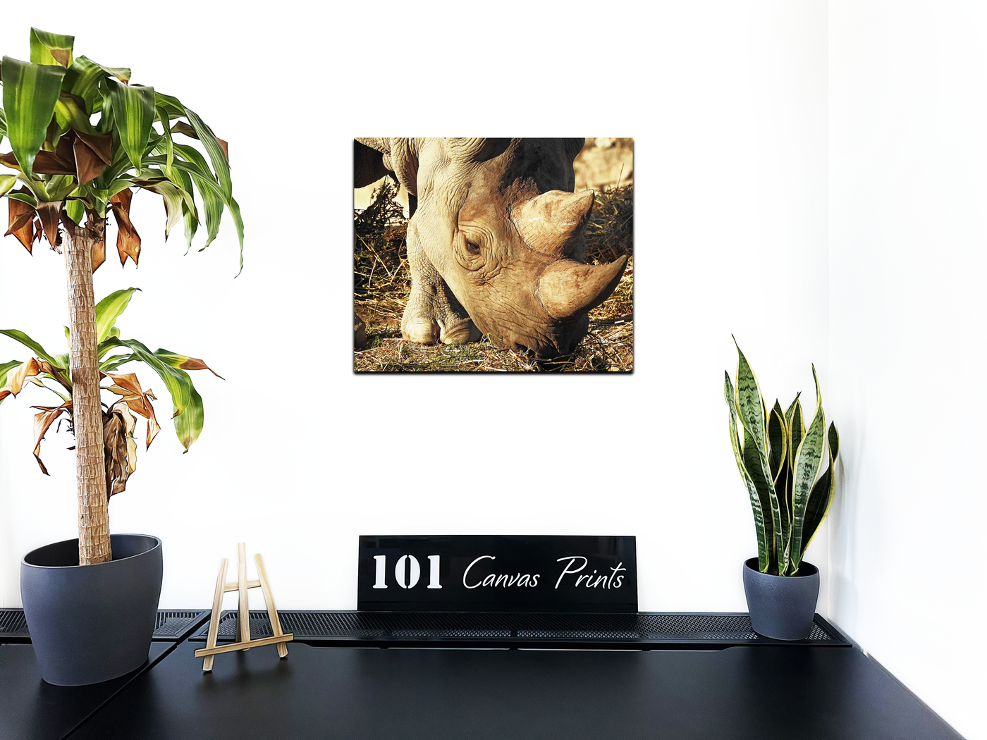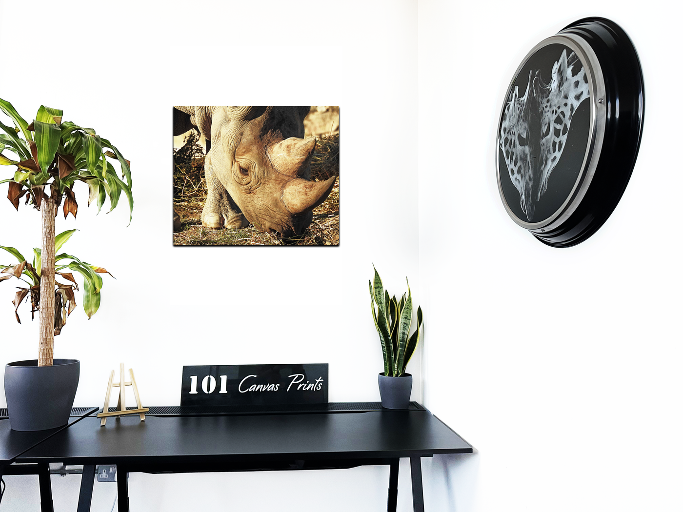 This remarkable close-up study of a Rhinoceros, expertly reproduced by the 101 Canvas Prints team, transforms an endangered giant into an intimate portrait of natural artistry. The photograph captures every intricate detail of the rhino's face, from its distinctive horn to the complex network of wrinkles that map its skin like ancient geographical features. The composition brings viewers face-to-face with this magnificent creature, creating an emotional connection through the gentle expression in its eye.