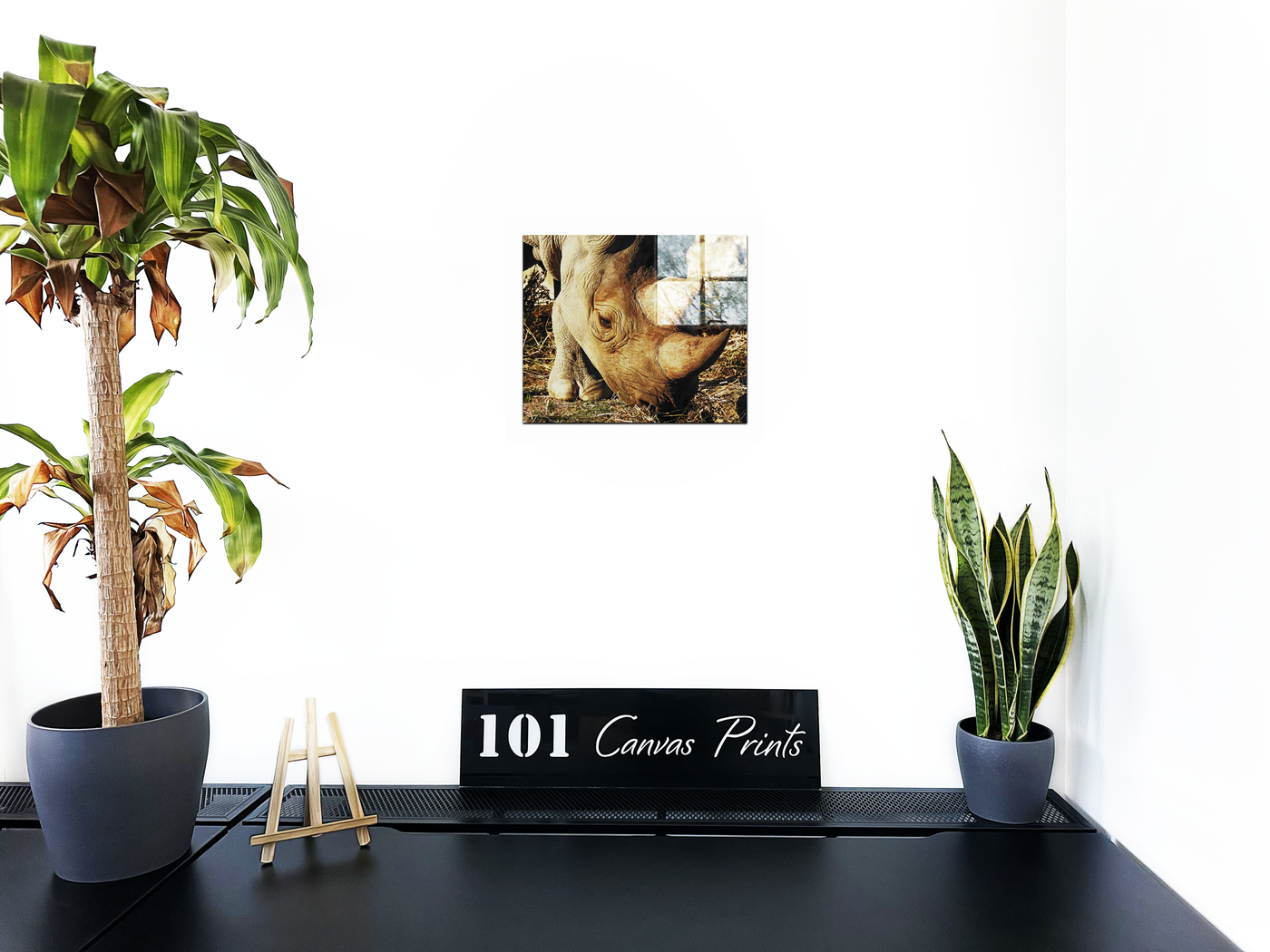 This remarkable close-up study of a Rhinoceros, expertly reproduced by the 101 Canvas Prints team, transforms an endangered giant into an intimate portrait of natural artistry. The photograph captures every intricate detail of the rhino's face, from its distinctive horn to the complex network of wrinkles that map its skin like ancient geographical features. The composition brings viewers face-to-face with this magnificent creature, creating an emotional connection through the gentle expression in its eye.