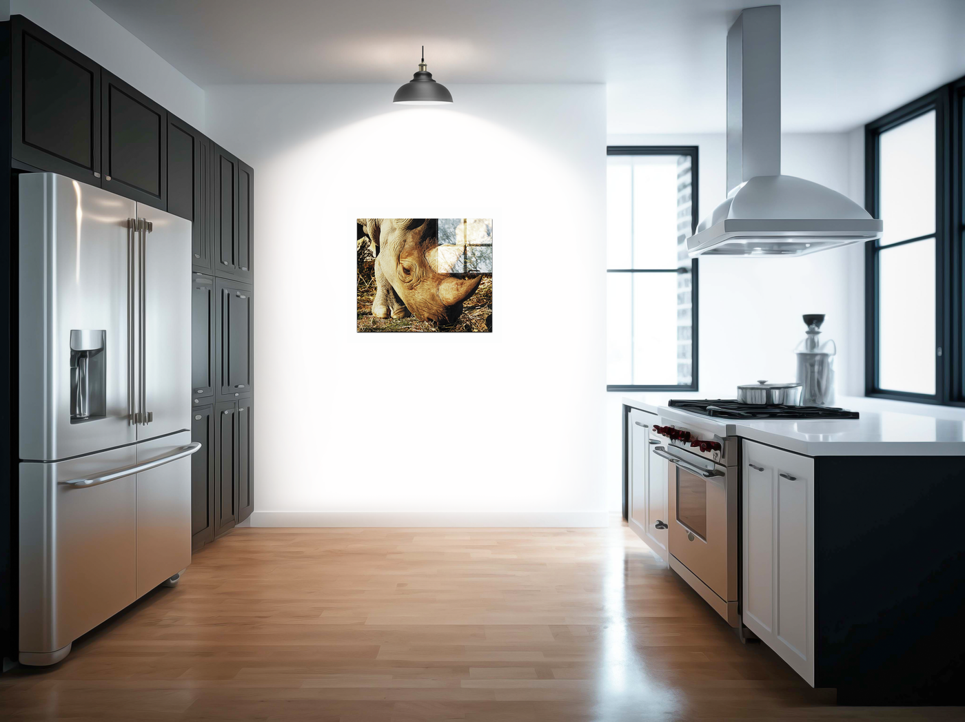 The photographer's mastery of light brings out an extraordinary range of textures and tones within the rhino's skin, from smooth, pale areas to deeply textured folds that resemble weathered leather. Through our precise photography and print enhancement process, we've maintained every nuance of detail and tone, ensuring that the full complexity of the subject is preserved with perfect clarity. The result is an image that serves both as a striking piece of art and a powerful reminder of the beauty of wildlife.