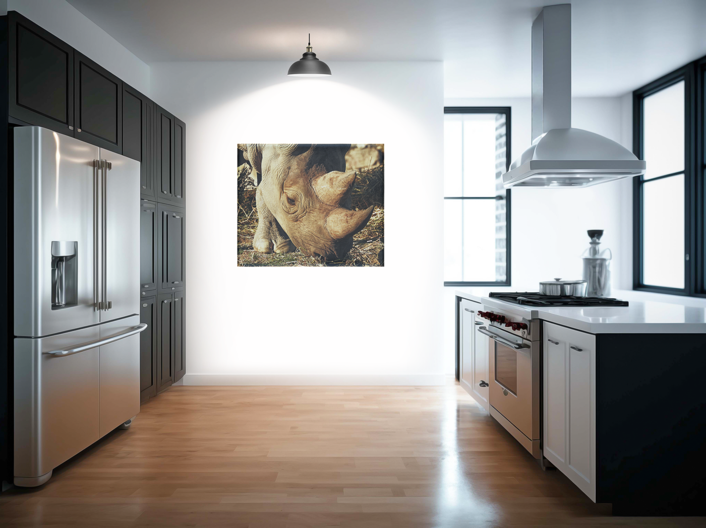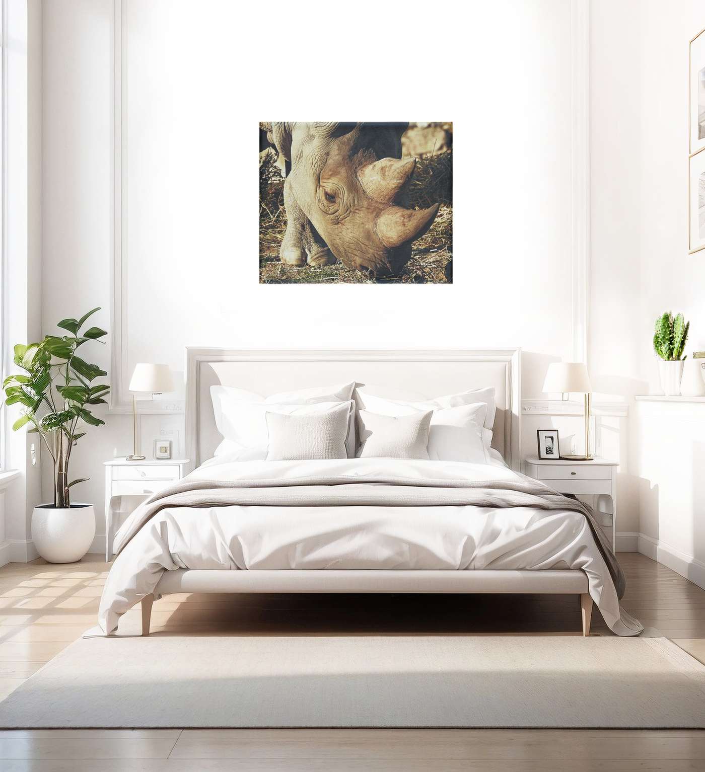 The colour palette is subtly sophisticated, working with warm earth tones that range from pale ivory to deep leather browns. Our print enhancement team have carefully preserved every detail of the rhino's distinctive features, from the complex patterns of its armoured hide to the delicate area around its eye, creating a portrait that is both documentary and artistic.