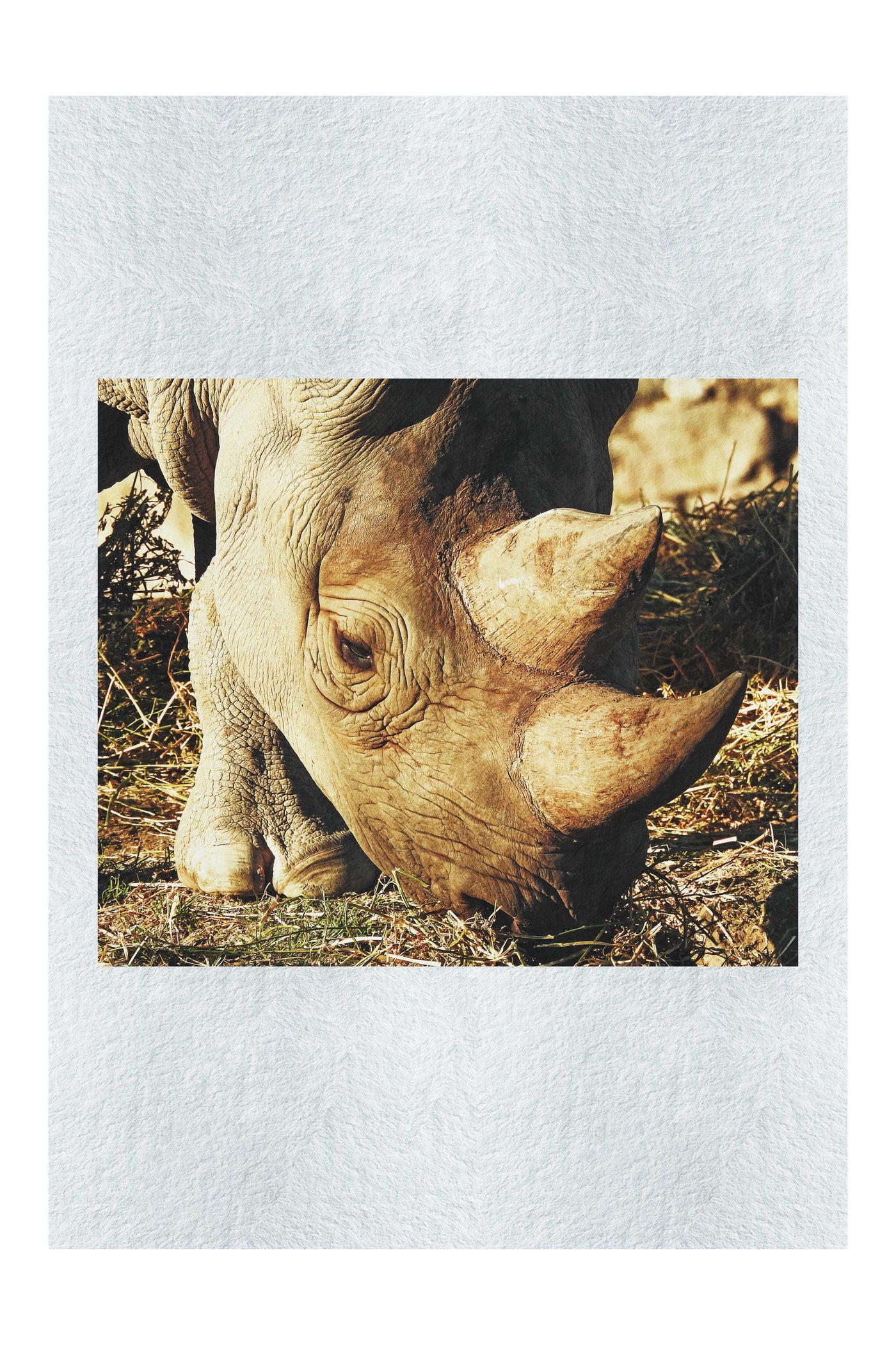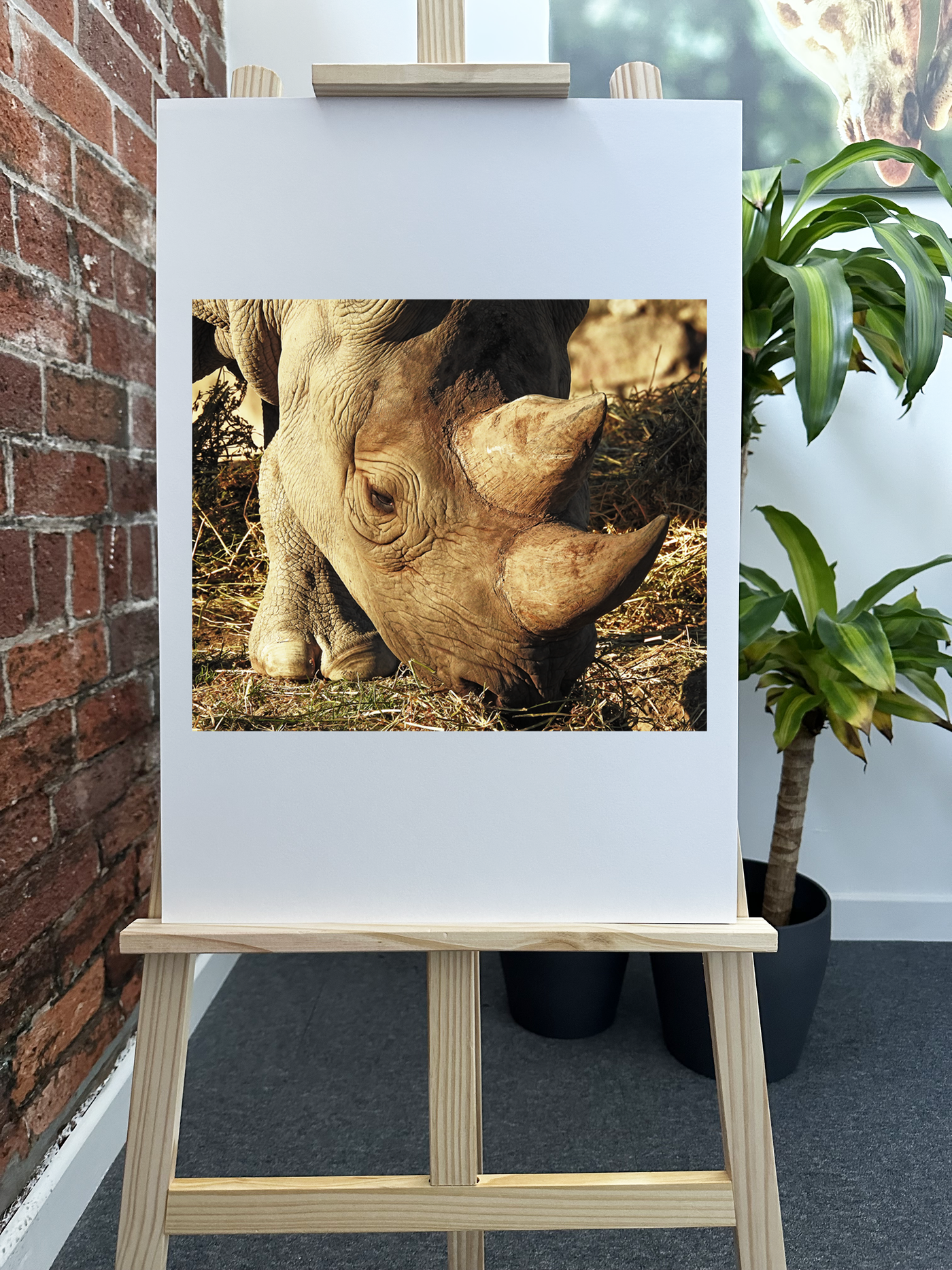 The colour palette is subtly sophisticated, working with warm earth tones that range from pale ivory to deep leather browns. Our print enhancement team have carefully preserved every detail of the rhino's distinctive features, from the complex patterns of its armoured hide to the delicate area around its eye, creating a portrait that is both documentary and artistic.