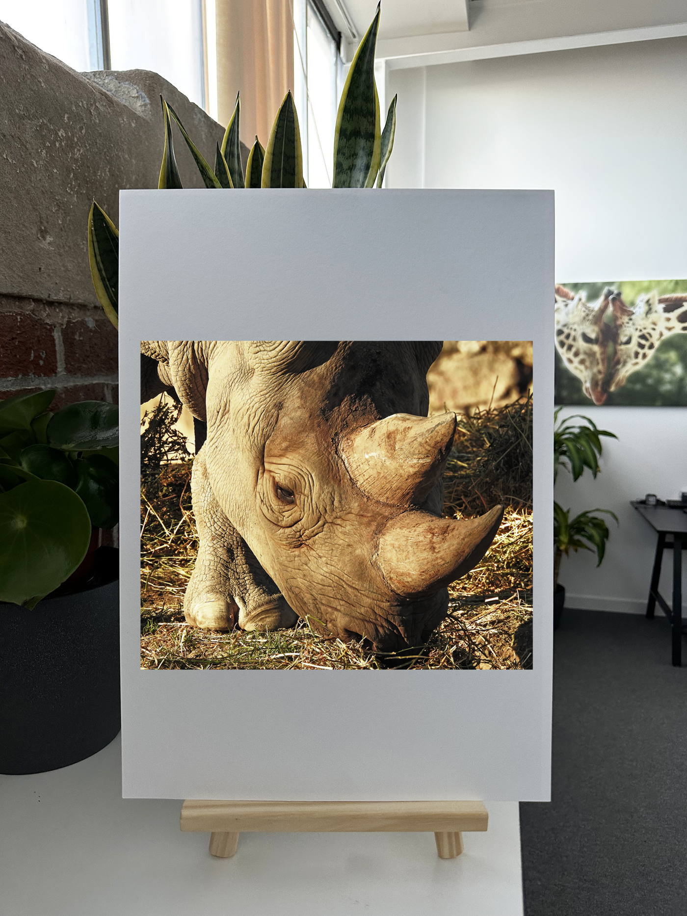 The colour palette is subtly sophisticated, working with warm earth tones that range from pale ivory to deep leather browns. Our print enhancement team have carefully preserved every detail of the rhino's distinctive features, from the complex patterns of its armoured hide to the delicate area around its eye, creating a portrait that is both documentary and artistic.