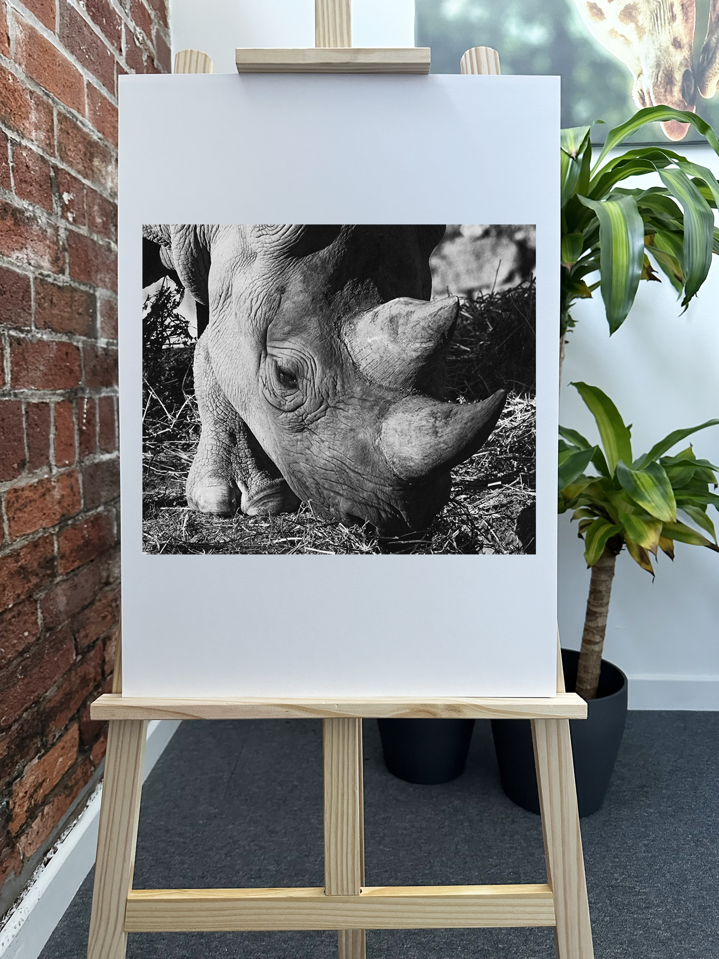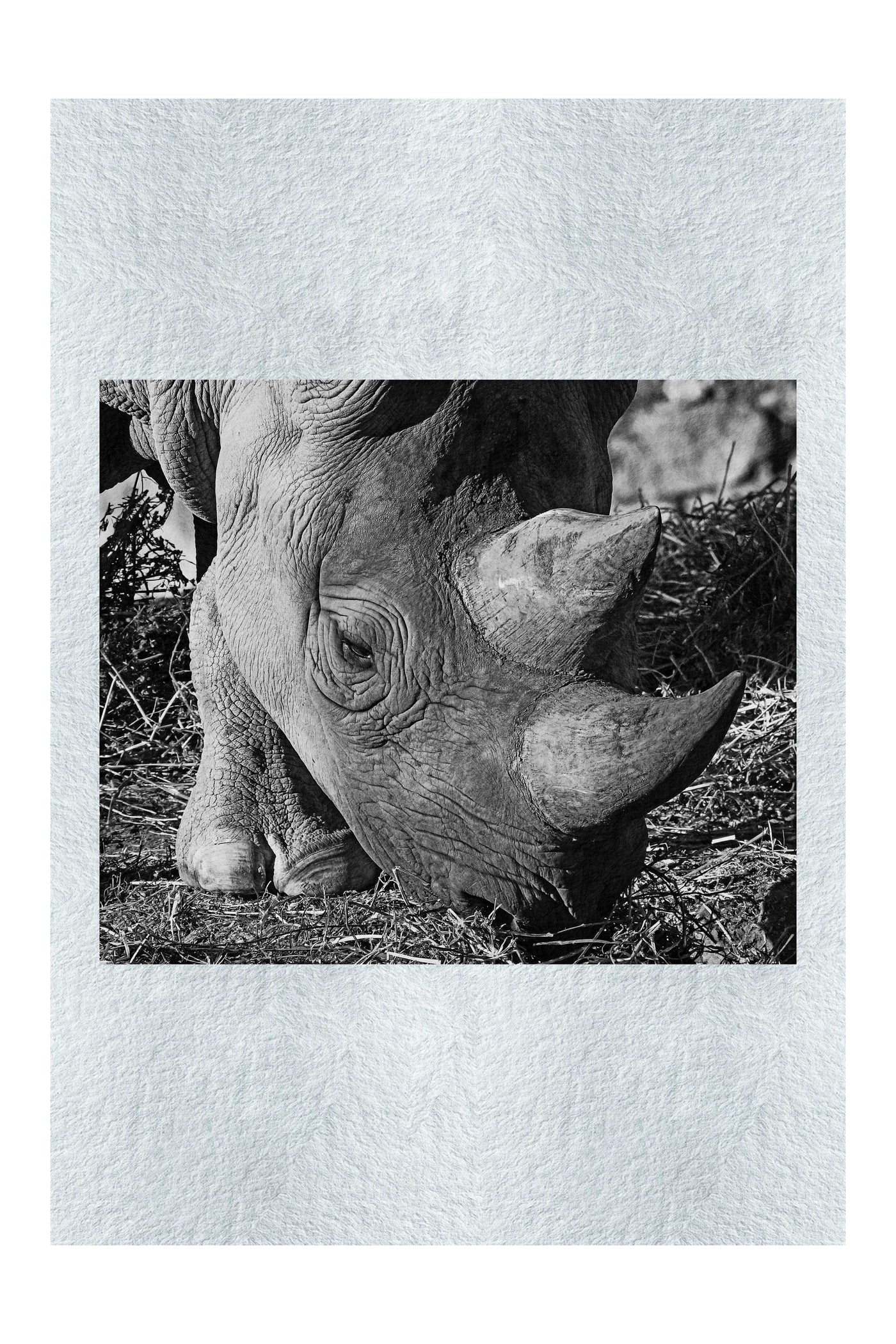 The tonality palette is subtly sophisticated, working with warm Monochrome earth tones that range from pale white ivory to deep leather blacks. Our print enhancement team have carefully preserved every detail of the rhino's distinctive features, from the complex patterns of its armoured hide to the delicate area around its eye, creating a portrait that is both documentary and artistic.