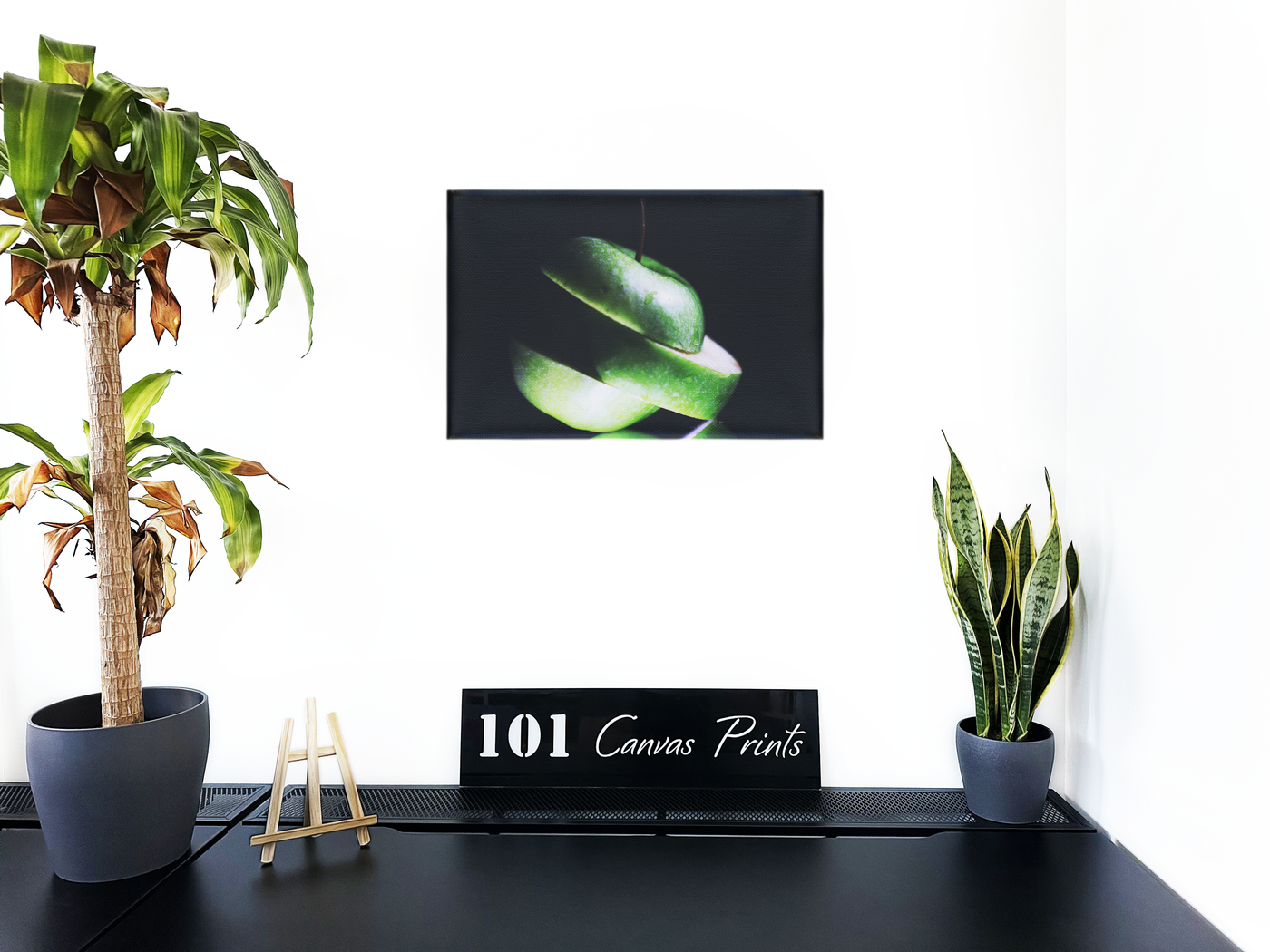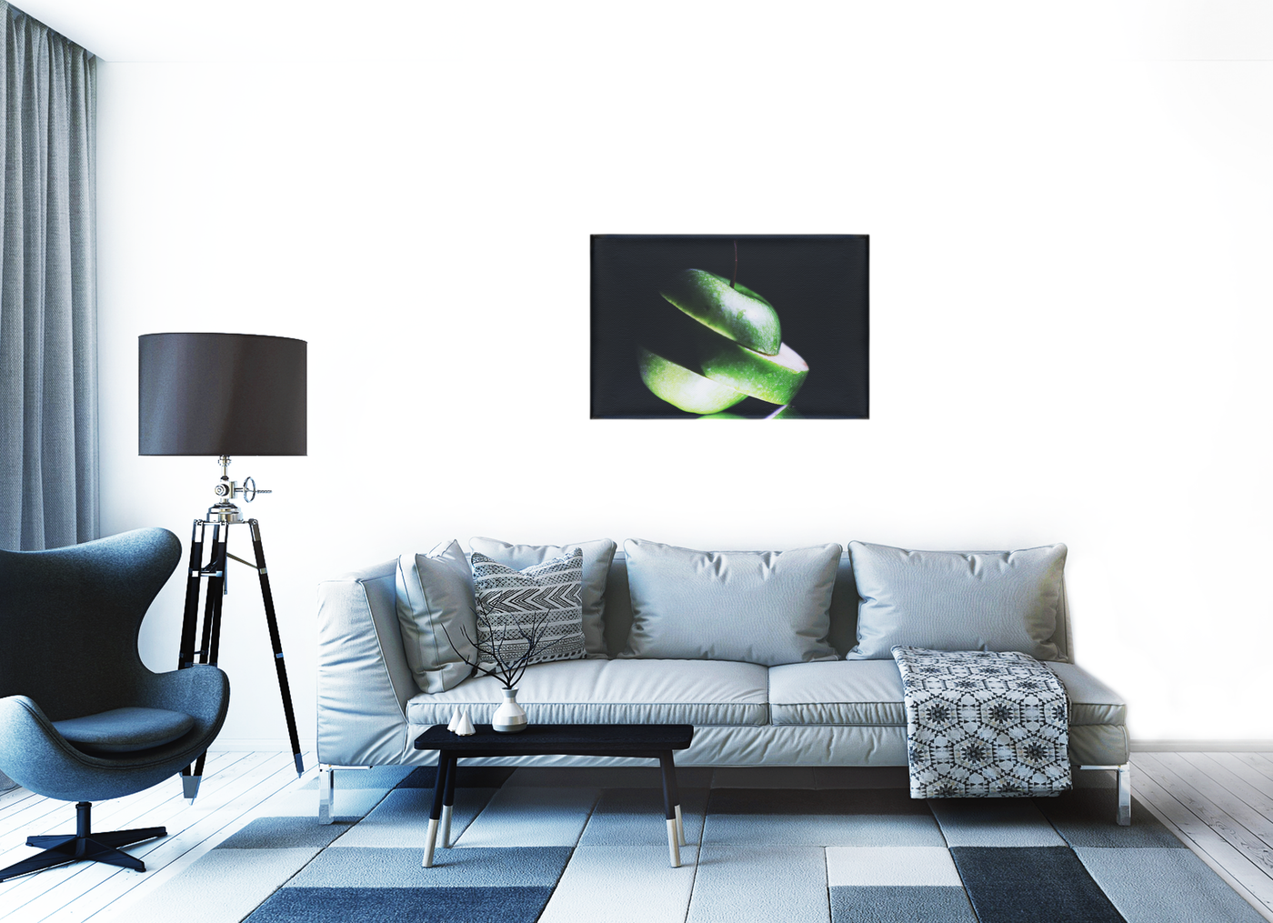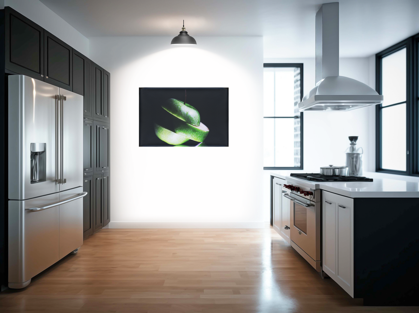 This striking Canvas print captures the essence of simplicity and freshness in a boldly minimalist style. The photograph showcases a vibrant green apple, artfully sliced to create an elegant spiral against a deep black background. The contrast is stark and compelling, drawing the eye immediately to the subject.