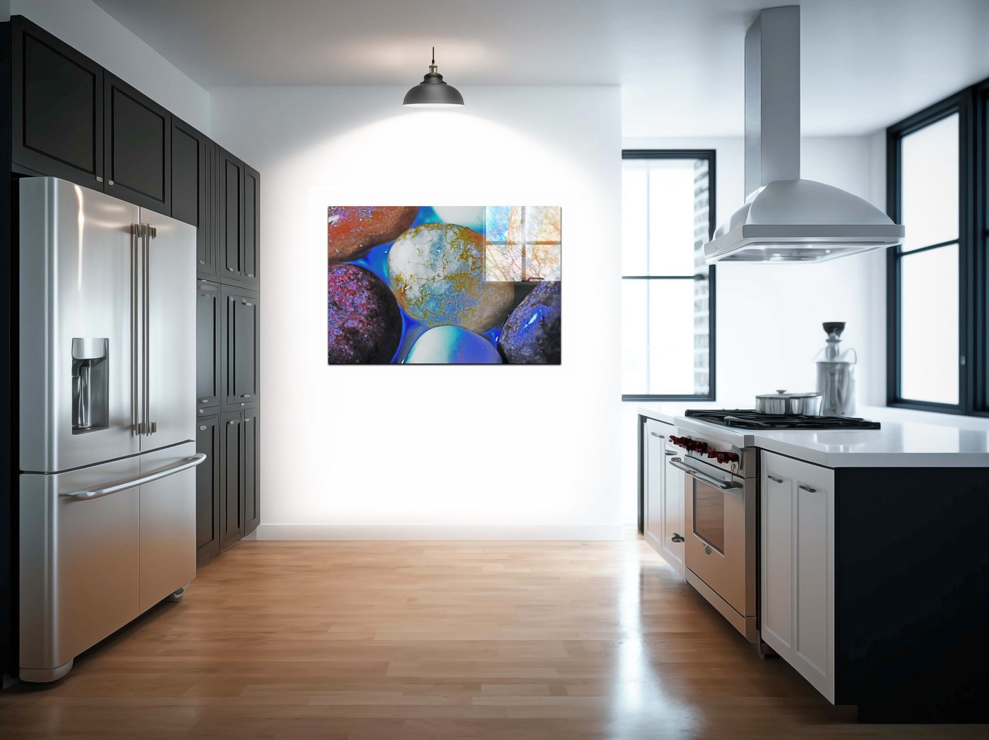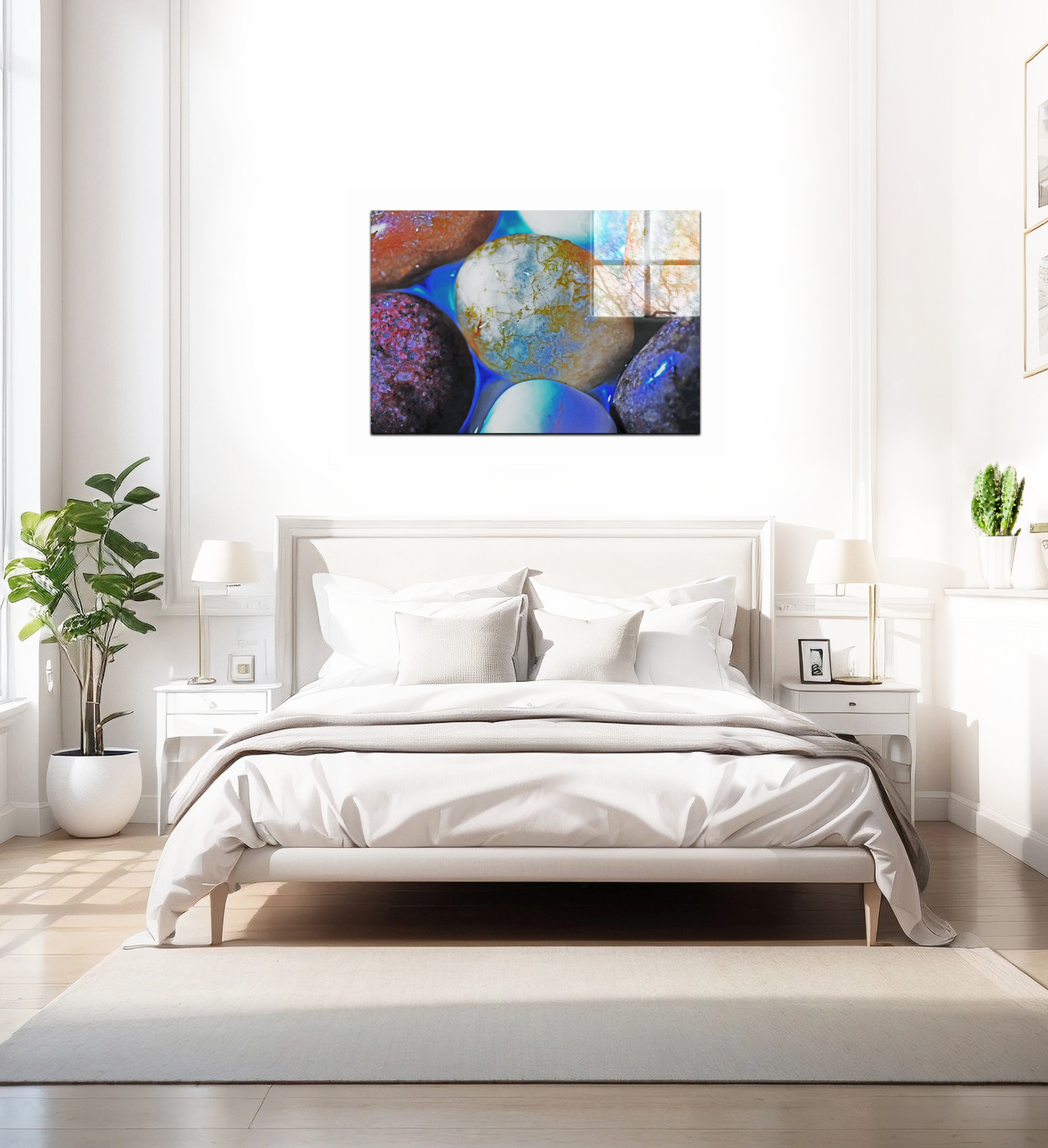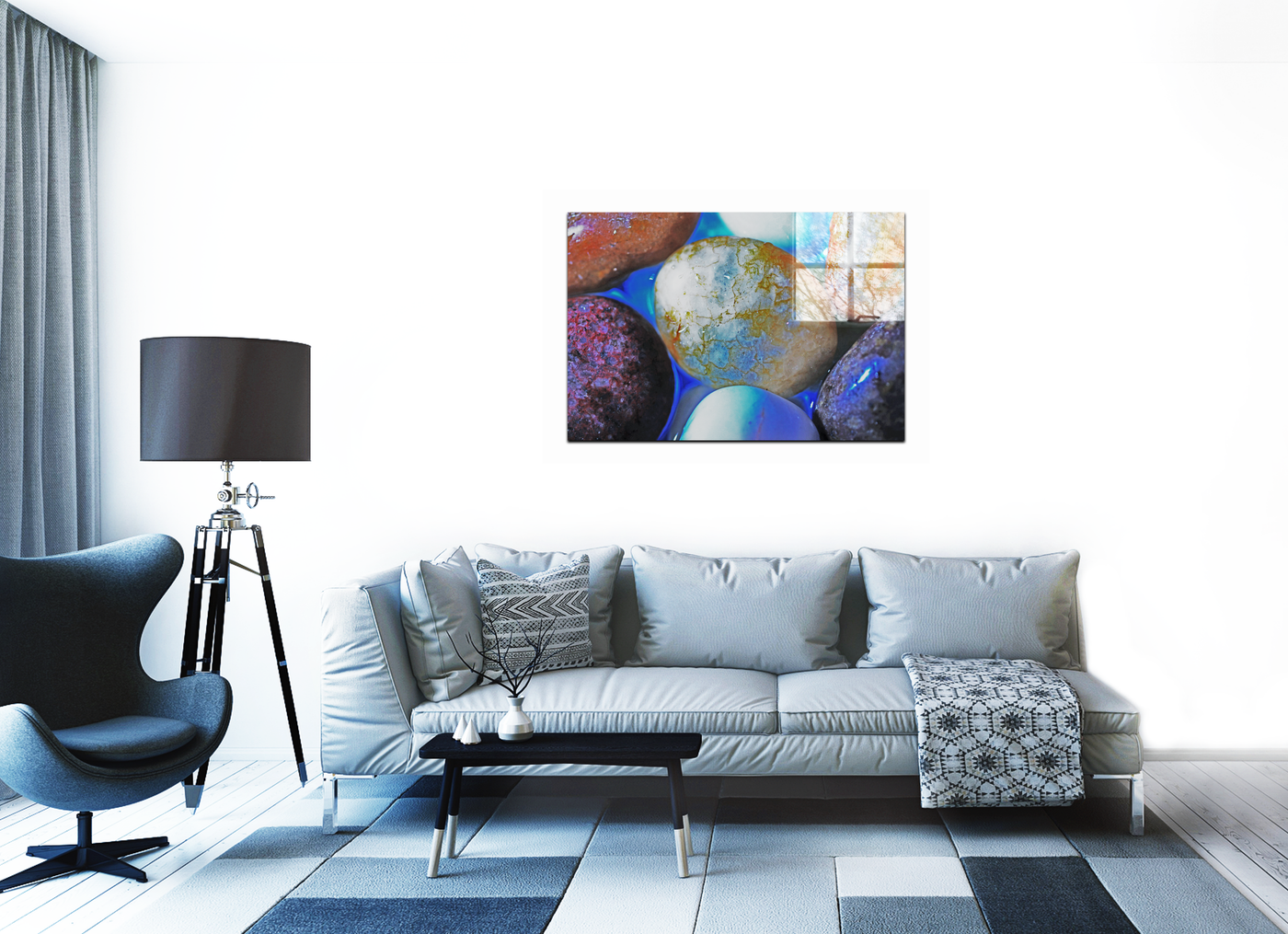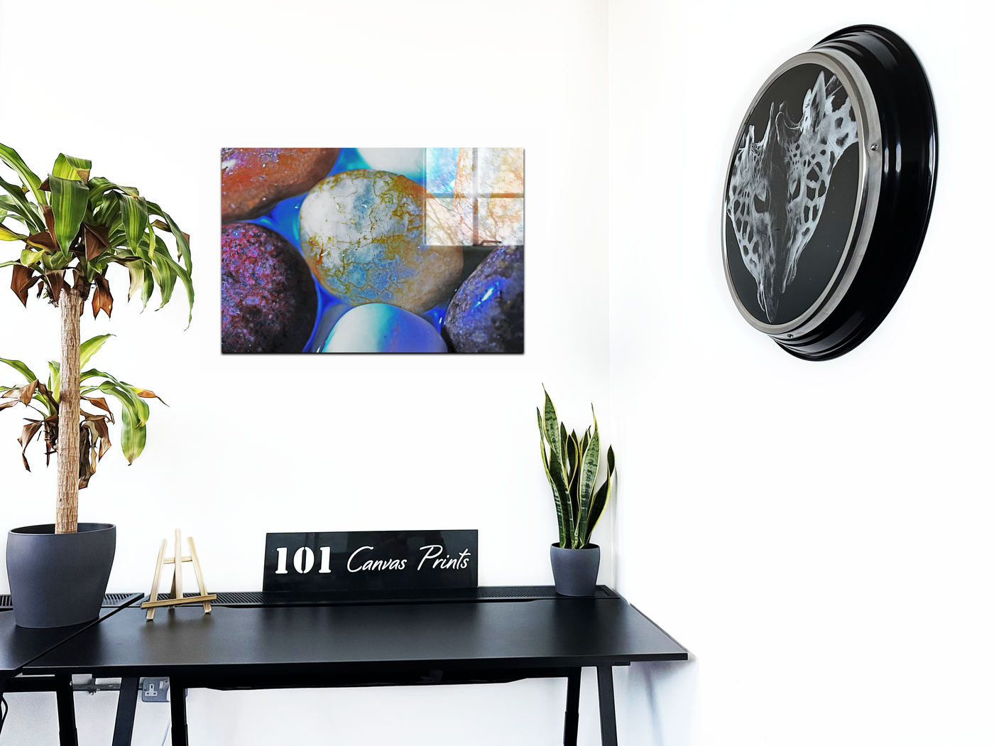Dive into a world where ordinary pebbles become extraordinary jewels with this stunning acrylic-set print. The image presents a close-up view of smooth, rounded stones, each one a unique work of art, arranged in a composition that is both natural and otherworldly. The focal point is a large, pale stone with intricate patterns across its surface, surrounded by smaller stones of varying colours and textures, all bathed in an ethereal blue light that seems to emanate from beneath them.