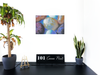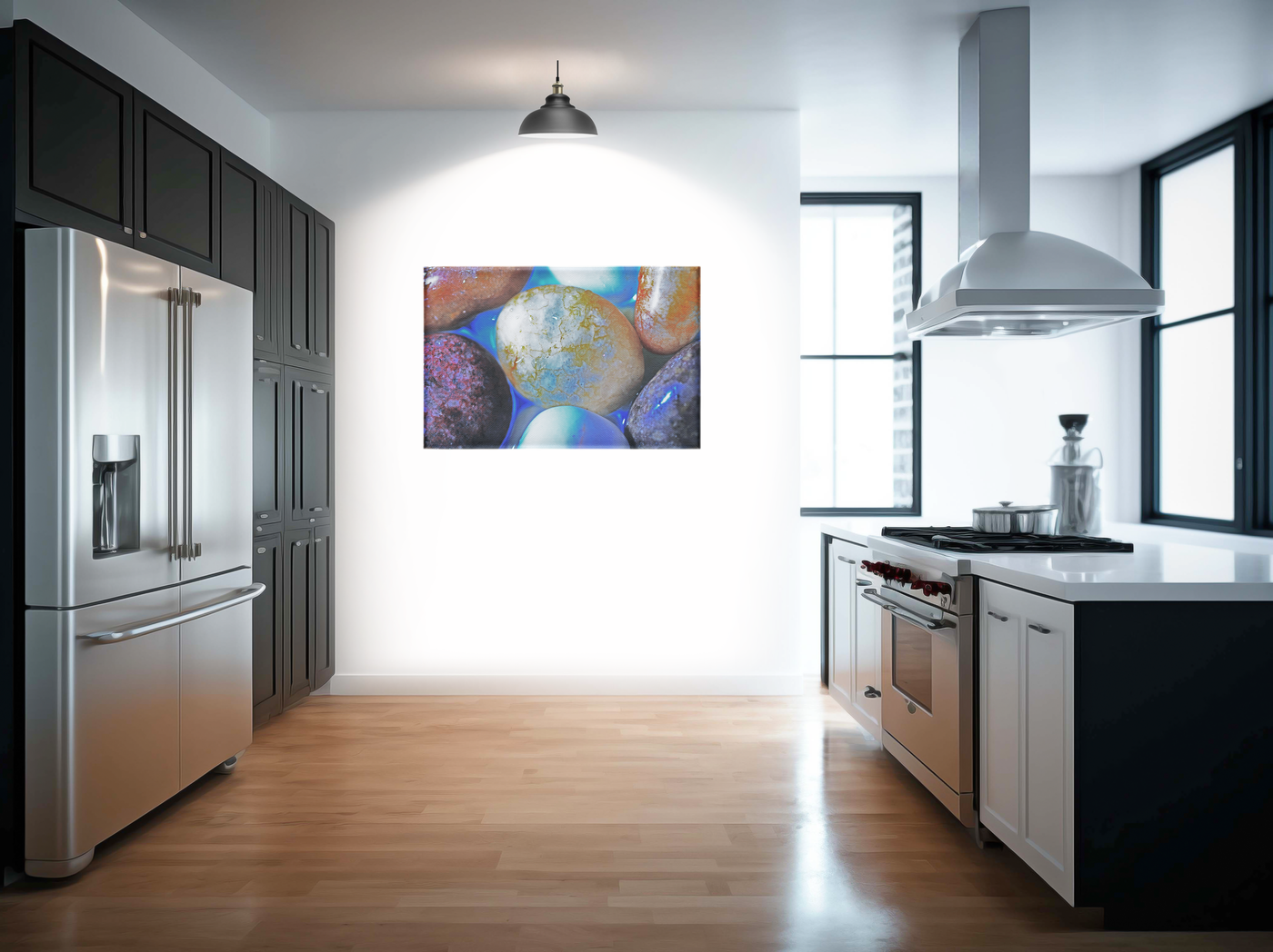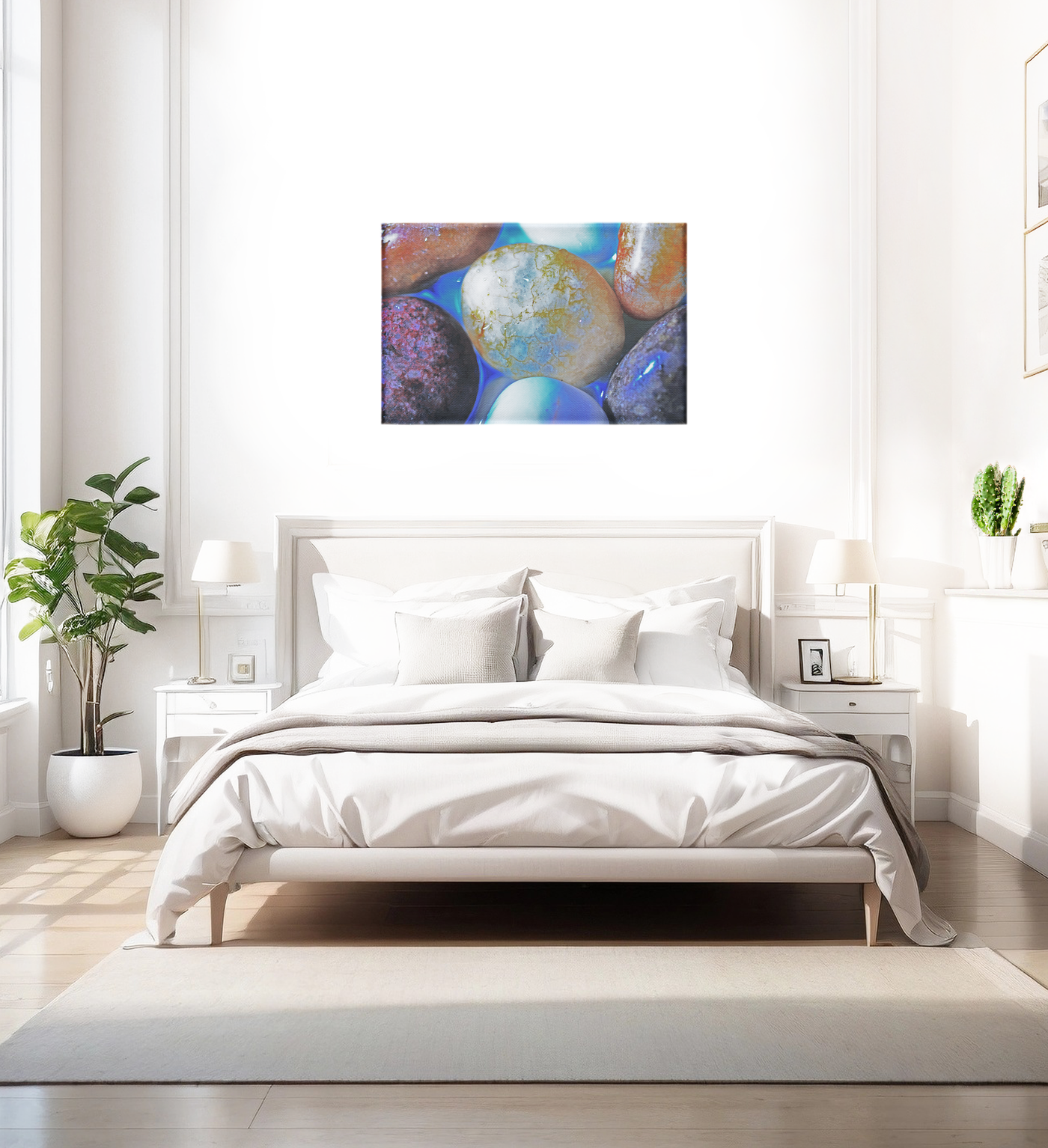 This captivating Canvas print presents an enchanting close-up of smooth, rounded pebbles or stones, transformed into a mesmerising tableau by clever lighting and composition. The image focuses on a collection of diverse stones, each with its own unique colouration and texture, set against a backdrop of ethereal blue light. The centrepiece is a large, pale stone with intricate patterns reminiscent of a planetary surface, surrounded by smaller stones in various hues and textures.