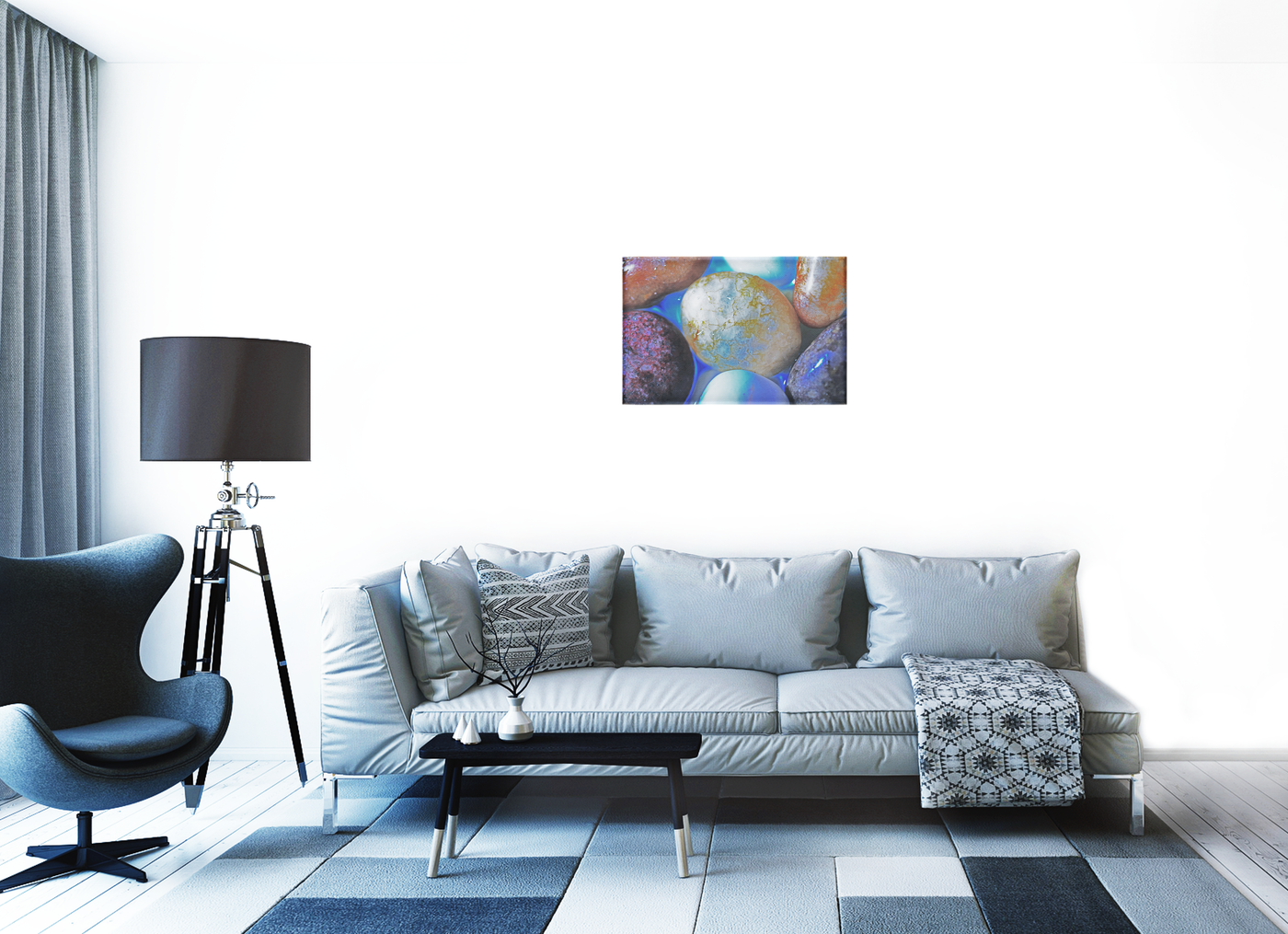 This captivating Canvas print presents an enchanting close-up of smooth, rounded pebbles or stones, transformed into a mesmerising tableau by clever lighting and composition. The image focuses on a collection of diverse stones, each with its own unique colouration and texture, set against a backdrop of ethereal blue light. The centrepiece is a large, pale stone with intricate patterns reminiscent of a planetary surface, surrounded by smaller stones in various hues and textures.