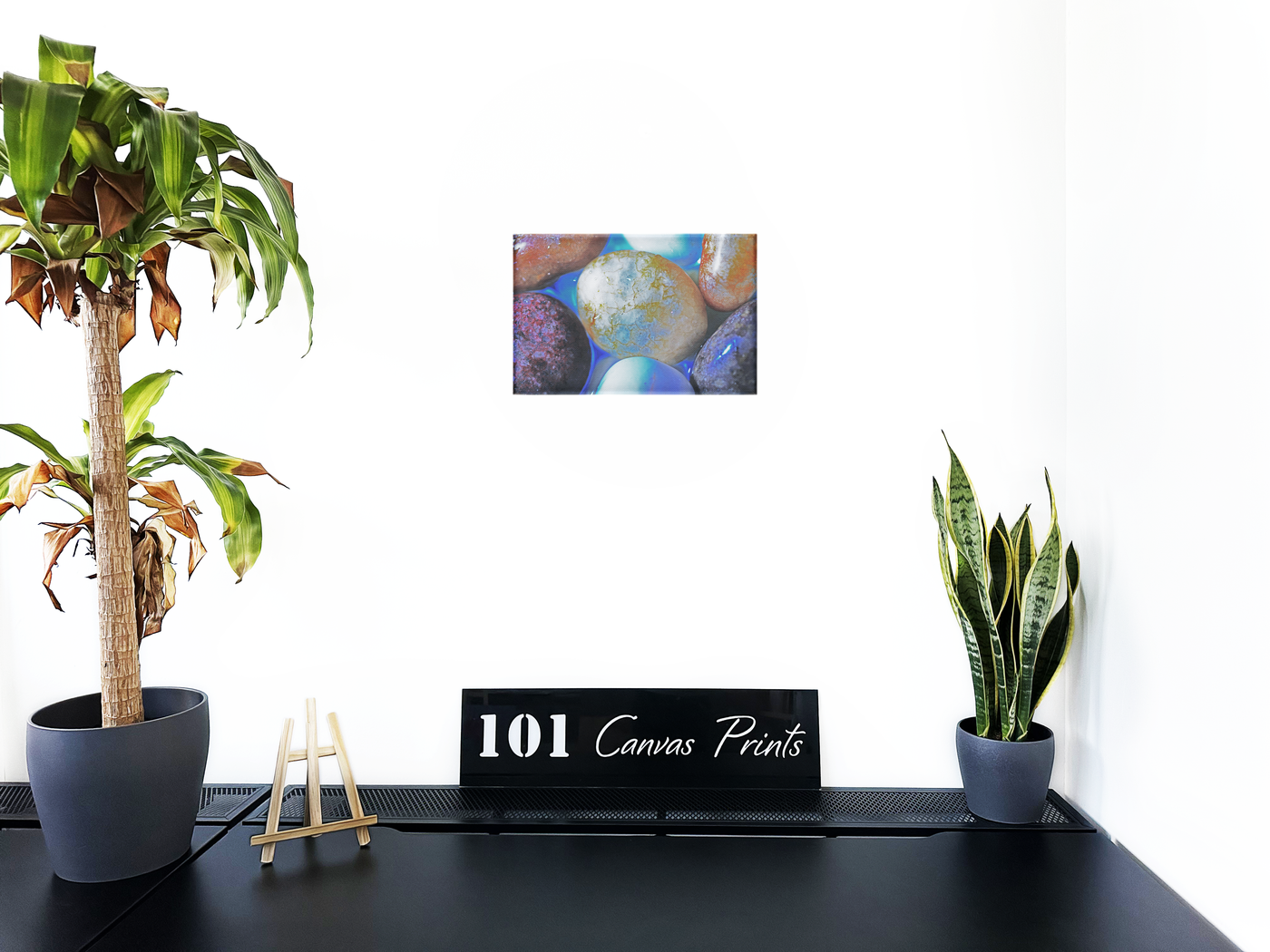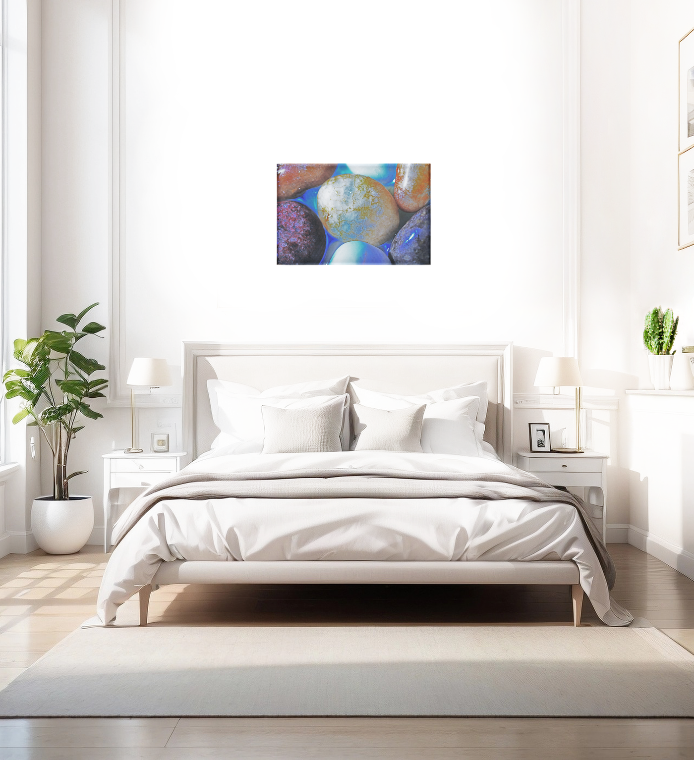 The Canvas medium beautifully complements this subject matter, its textured surface enhancing the tactile quality of the stones. The matte finish of the Canvas softens the blue glow, creating a dreamy, atmospheric effect that draws the viewer into this miniature world. This artwork would make a striking addition to any space, from a contemporary bathroom where it could evoke a sense of tranquil waters, to a meditation room where it could serve as a focus for contemplation. It's a piece that invites closer inspection, revealing new details and sparking the imagination with each viewing.