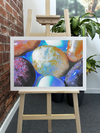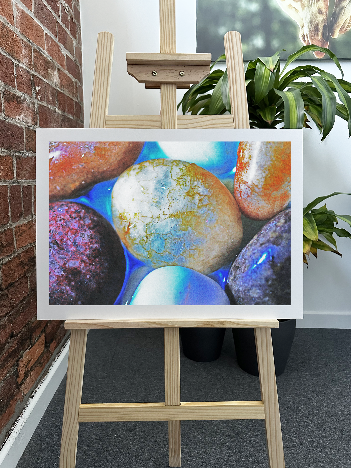This captivating Fine Art print presents an enchanting close-up of smooth, rounded pebbles or stones, transformed into a mesmerising tableau by clever lighting and composition. The image focuses on a collection of diverse stones, each with its own unique colouration and texture, set against a backdrop of ethereal blue light. The centrepiece is a large, pale stone with intricate patterns reminiscent of a planetary surface, surrounded by smaller stones in various hues and textures.