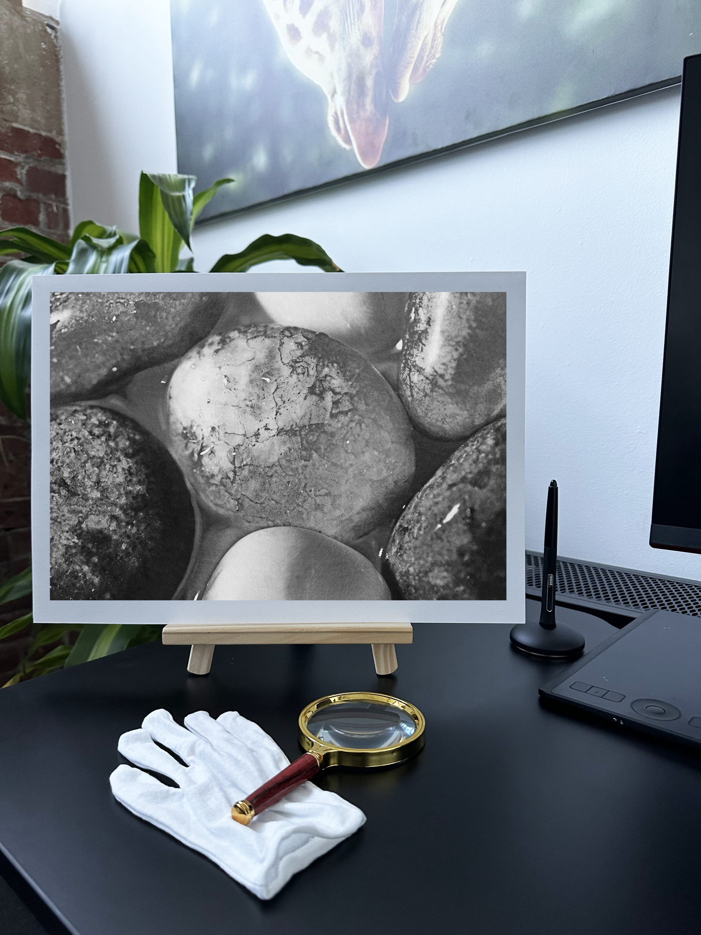 The Fine Art medium beautifully complements this subject matter, its textured surface enhancing the tactile quality of the stones. The matte finish of the Fine Art paper softens the Monochrome glow, creating a dreamy, atmospheric effect that draws the viewer into this miniature world. This artwork would make a striking addition to any space, from a contemporary bathroom where it could evoke a sense of tranquil waters, to a meditation room where it could serve as a focus for contemplation. It's a piece that invites closer inspection, revealing new details and sparking the imagination with each viewing.