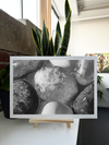 This captivating Monochrome Fine Art print presents an enchanting close-up of smooth, rounded pebbles or stones, transformed into a mesmerising tableau by clever lighting and composition. The image focuses on a collection of diverse stones, each with its own unique colouration and texture, set against a backdrop of ethereal Monochrome light. The centrepiece is a large, pale stone with intricate patterns reminiscent of a planetary surface, surrounded by smaller stones in various hues and textures.