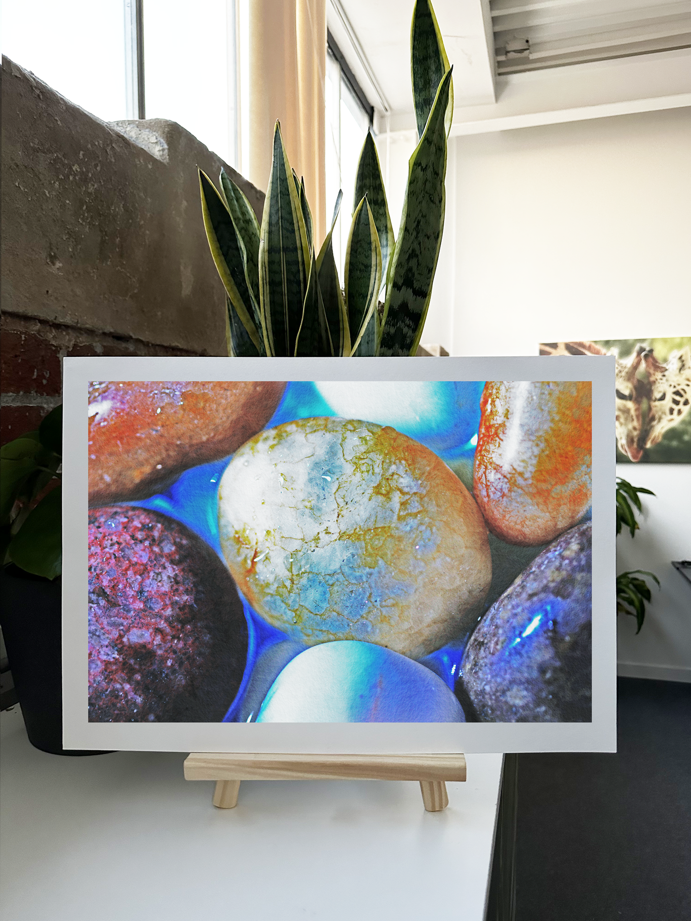 This captivating Fine Art print presents an enchanting close-up of smooth, rounded pebbles or stones, transformed into a mesmerising tableau by clever lighting and composition. The image focuses on a collection of diverse stones, each with its own unique colouration and texture, set against a backdrop of ethereal blue light. The centrepiece is a large, pale stone with intricate patterns reminiscent of a planetary surface, surrounded by smaller stones in various hues and textures.