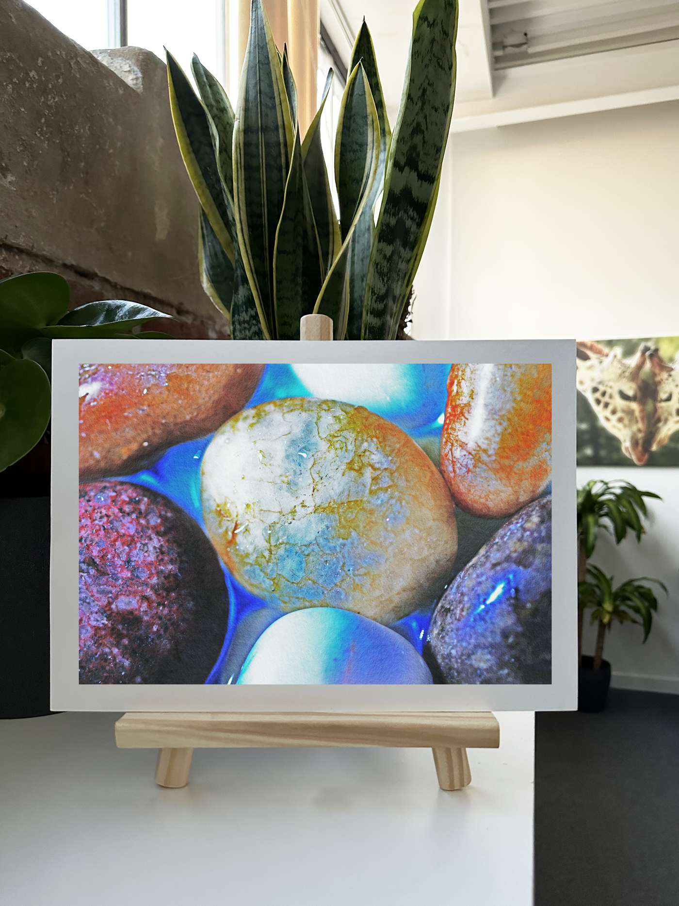 This captivating Fine Art print presents an enchanting close-up of smooth, rounded pebbles or stones, transformed into a mesmerising tableau by clever lighting and composition. The image focuses on a collection of diverse stones, each with its own unique colouration and texture, set against a backdrop of ethereal blue light. The centrepiece is a large, pale stone with intricate patterns reminiscent of a planetary surface, surrounded by smaller stones in various hues and textures.