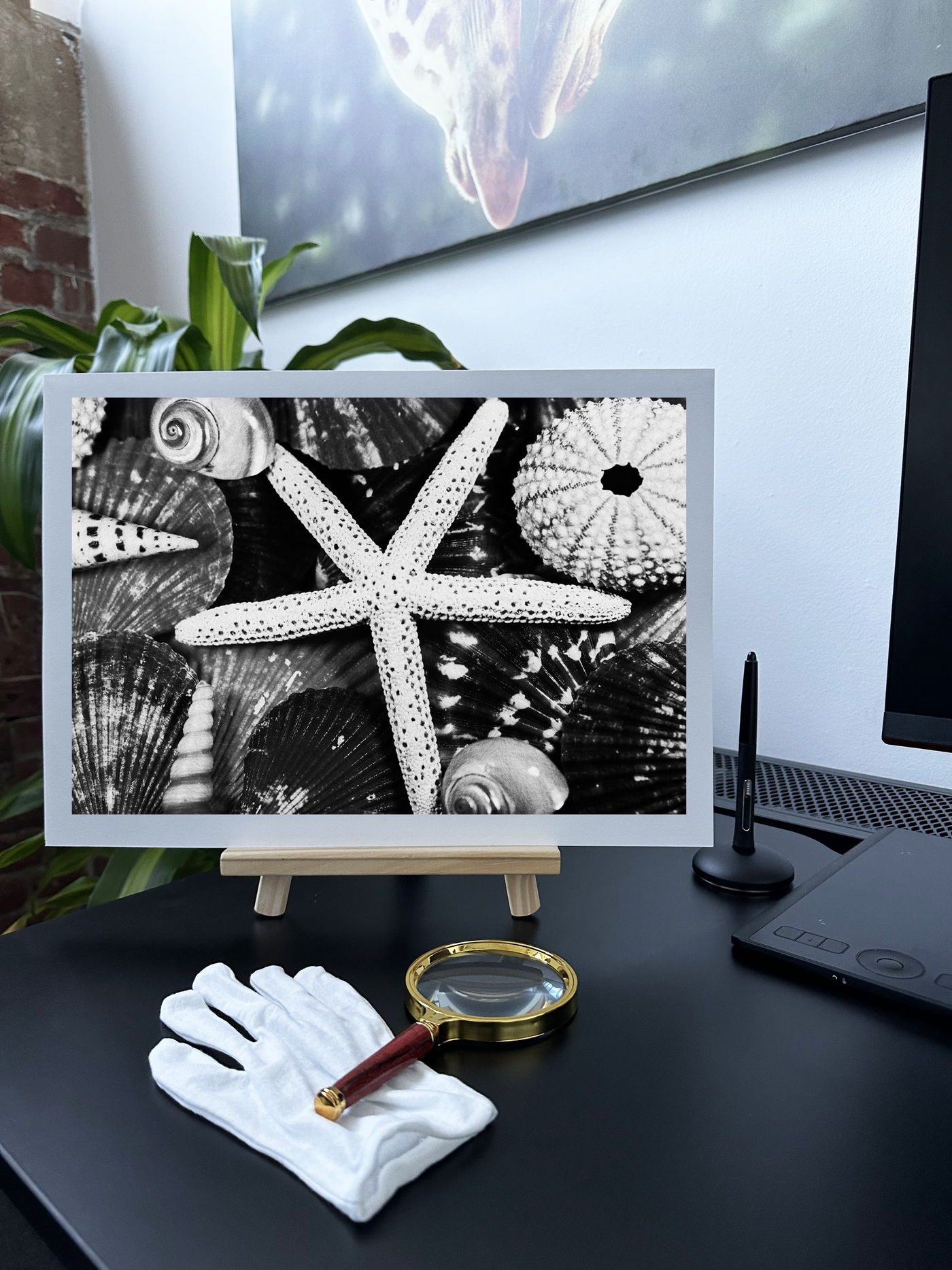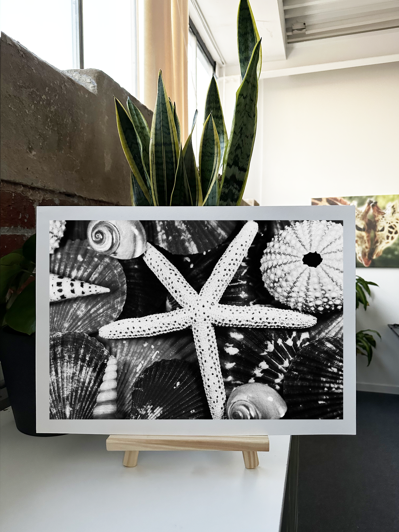 Filled with varying phenomenally bright Monochrome tones, it is hard to believe they are of this Earth. Taken with our high-resolution Professional Camera, every indent of the starfish and apertural teeth of the seashells are captured and enhanced.
