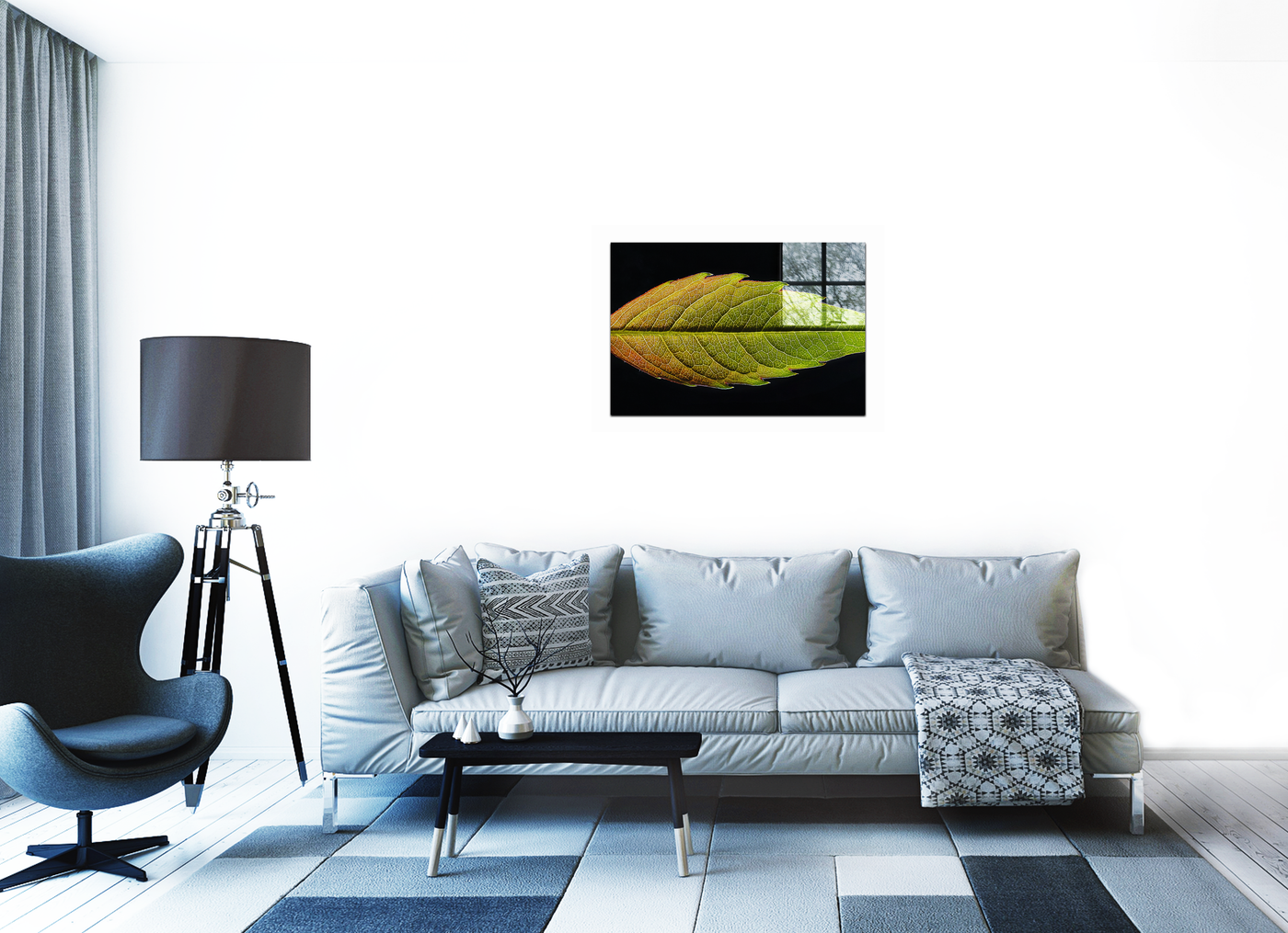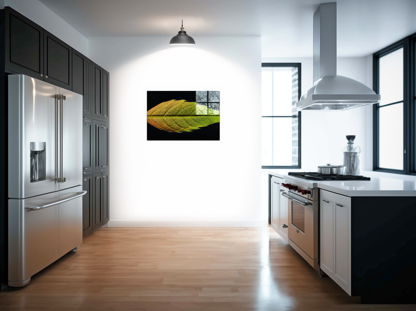 When produced as an acrylic-set print, this image takes on a new dimension of depth and luminosity. The high-gloss finish of the Acrylic dramatically enhances the contrast between the leaf and the dark background, making the leaf appear to float in space. The Acrylic medium intensifies the colours, bringing out the warmth of the autumnal tones and the freshness of the greens, while also highlighting the intricate network of veins that give the leaf its structure.