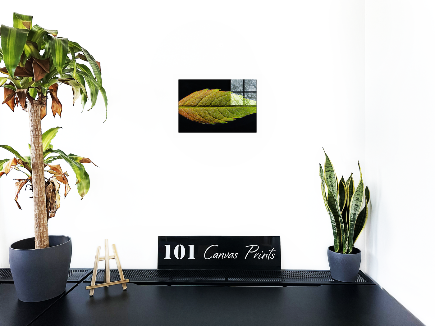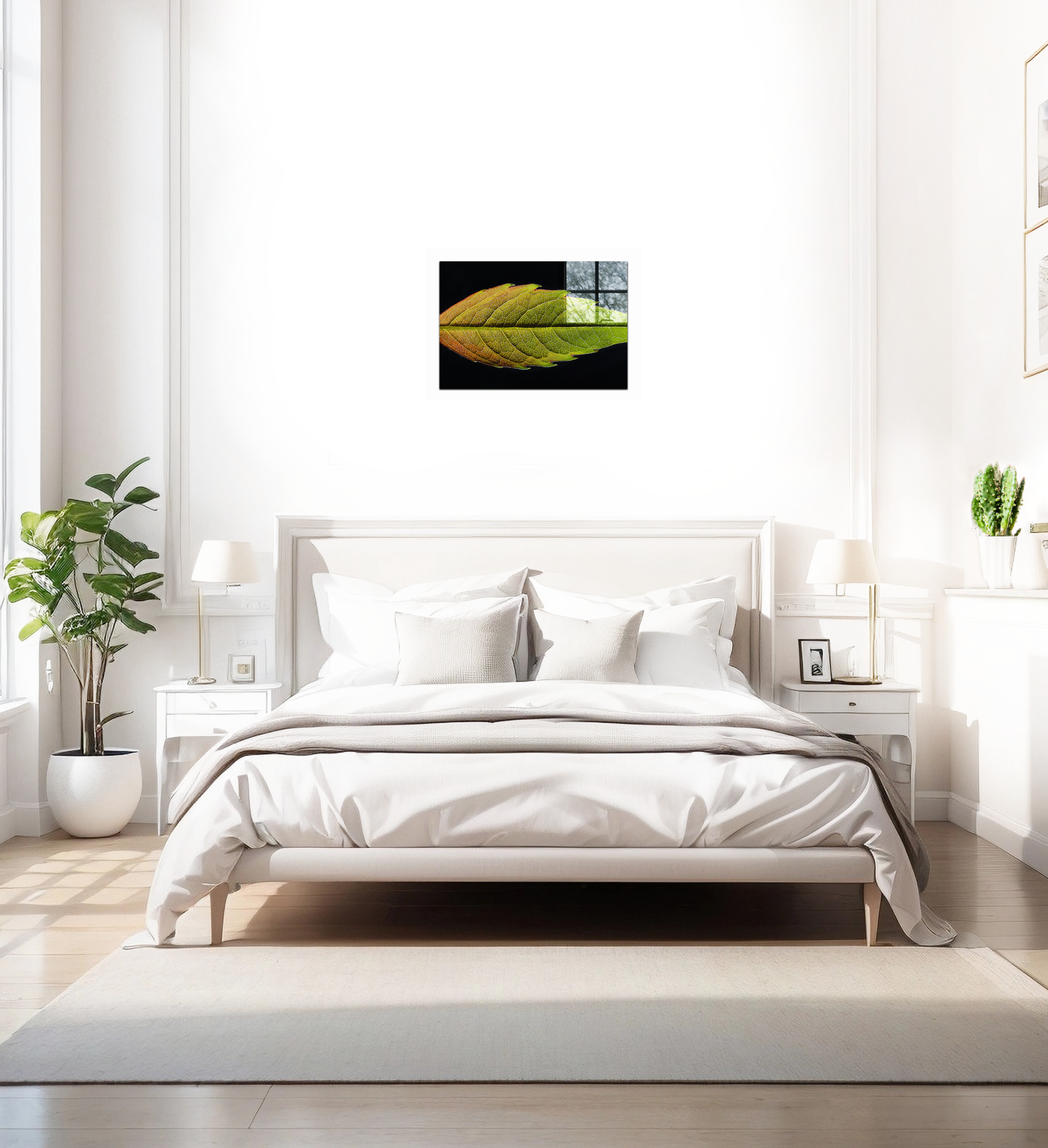 When produced as an acrylic-set print, this image takes on a new dimension of depth and luminosity. The high-gloss finish of the Acrylic dramatically enhances the contrast between the leaf and the dark background, making the leaf appear to float in space. The Acrylic medium intensifies the colours, bringing out the warmth of the autumnal tones and the freshness of the greens, while also highlighting the intricate network of veins that give the leaf its structure.