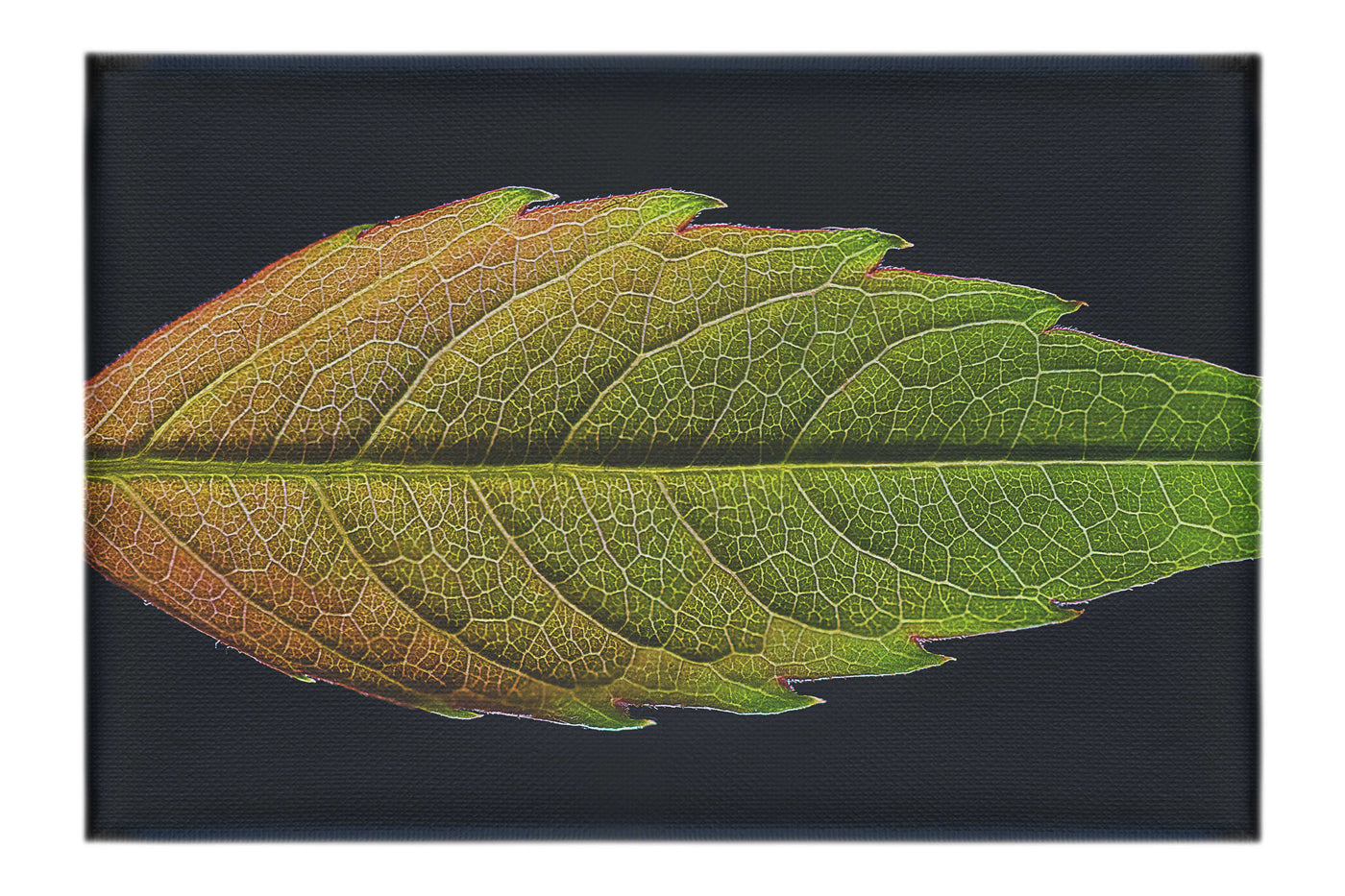 This striking photograph captures the intricate beauty of a single leaf in extraordinary detail. The composition centres on the leaf, positioned horizontally across the frame against a dark background, creating a dramatic contrast that emphasises its structure. The image reveals the leaf's complex network of veins, from the prominent central vein to the delicate capillaries branching out to its serrated edges.