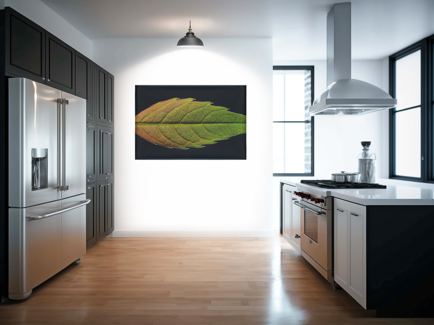 The colour palette is a testament to nature's artistry, showcasing a gradient that spans from rich, autumnal reds and golds on one side to vibrant, life-affirming greens on the other. This transition of colours tells the story of the leaf's life cycle, capturing a moment of change and beauty. The dark background serves to accentuate the leaf's luminous qualities, making it appear to glow from within.