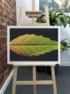 The colour palette is a testament to nature's artistry, showcasing a gradient that spans from rich, autumnal reds and golds on one side to vibrant, life-affirming greens on the other. This transition of colours tells the story of the leaf's life cycle, capturing a moment of change and beauty. The dark background serves to accentuate the leaf's luminous qualities, making it appear to glow from within.