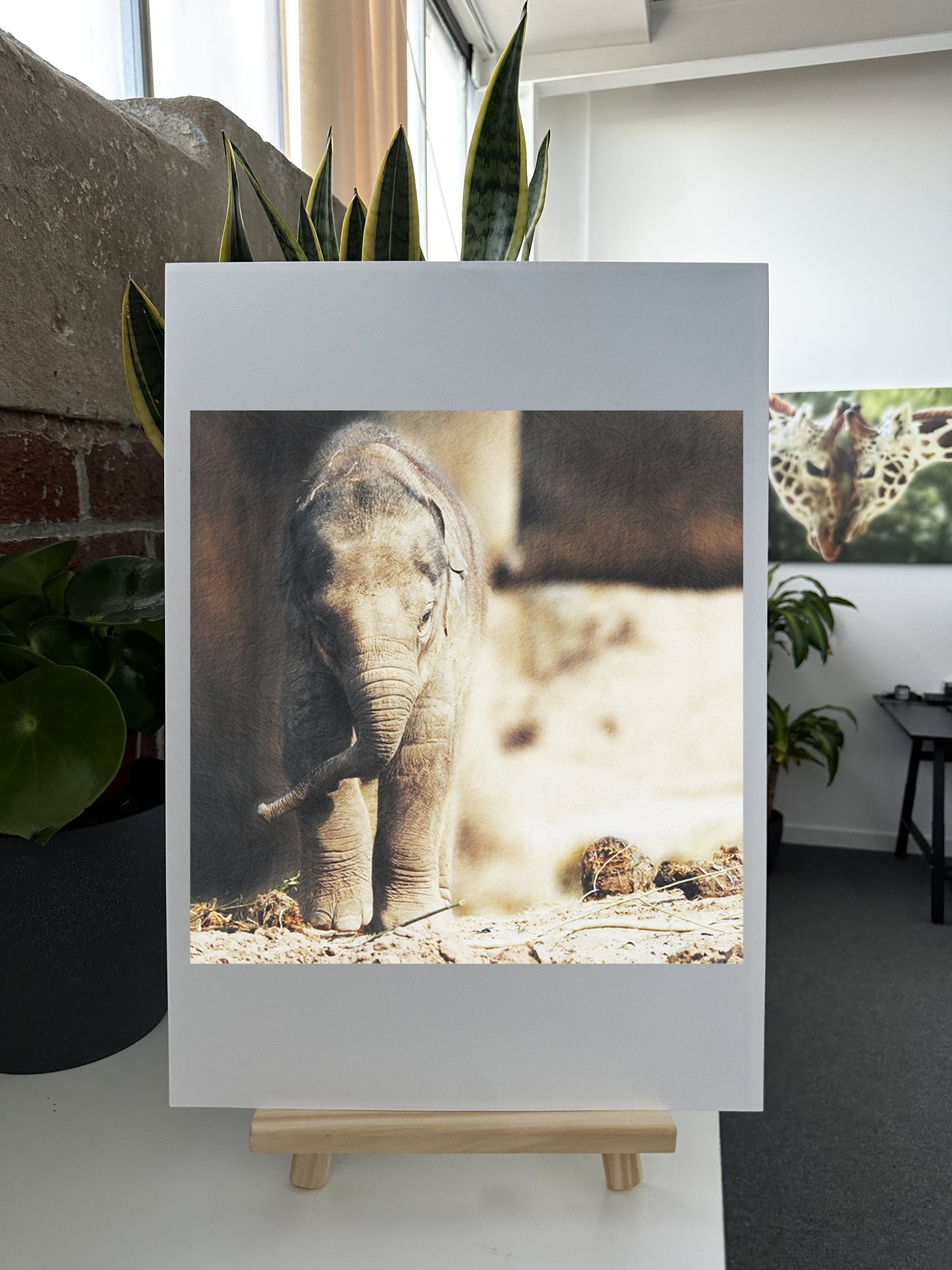 Meet the newest addition to the herd! This playful Fine Art print features a baby Elephant in the foreground—its trunk curled in a shy but curious pose—with its mother waiting in the background. A great way to introduce a new baby boy or girl into your family, it will be sure to bring warmth and cheeriness into any room.
