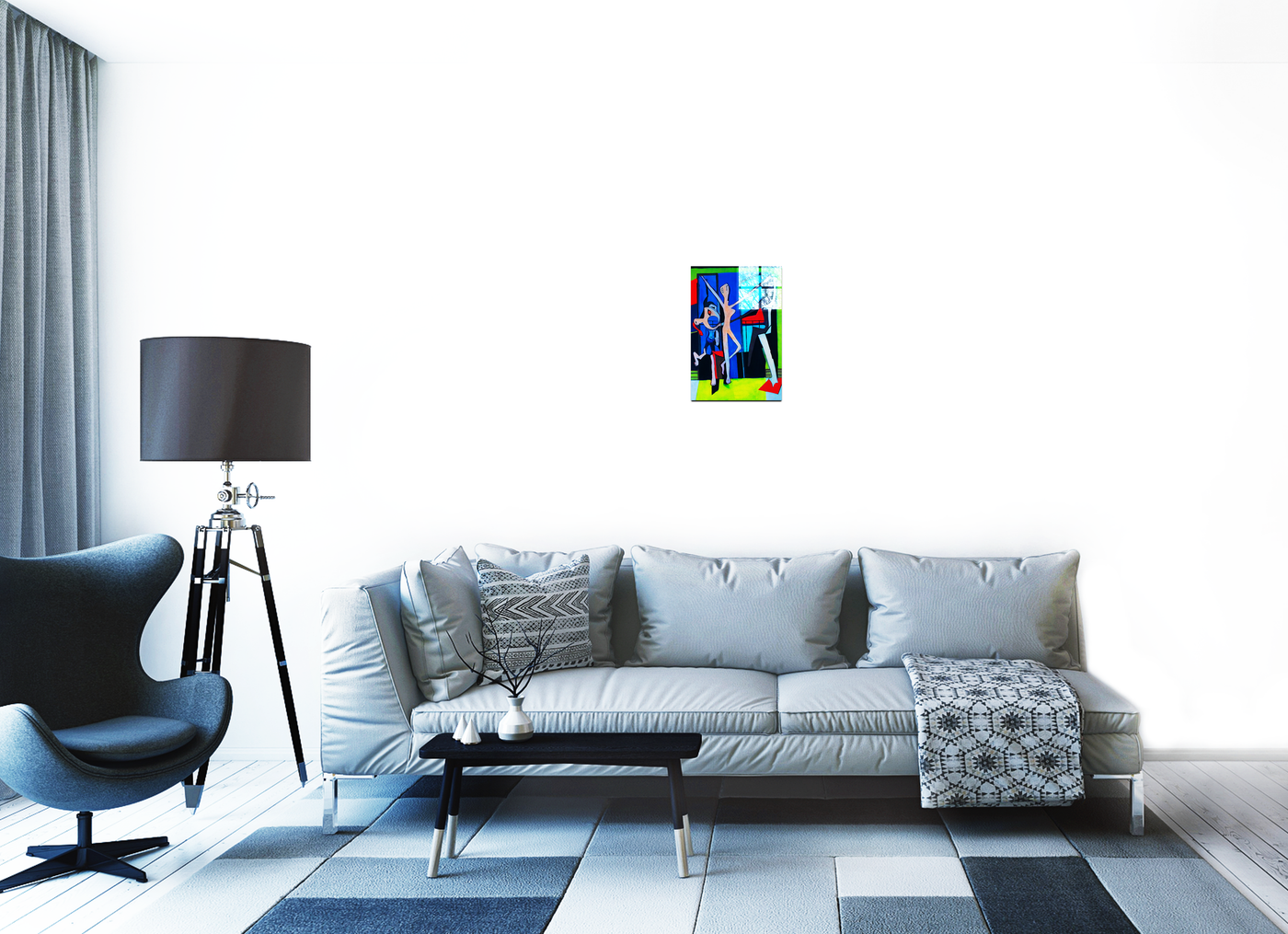 The artist's masterful use of colour creates a powerful visual impact, with deep blues suggesting the evening atmosphere and vibrant lime greens framing the scene with festive energy. Carefully placed red accents punctuate the composition like musical notes, while the pale figures seem to float and move through the space. Through our precise photography and print enhancement process, we've maintained every subtle detail that contributes to both the cultural narrative and the modernist aesthetic, from the angular geometric forms to the subtle interplay of light and shadow.