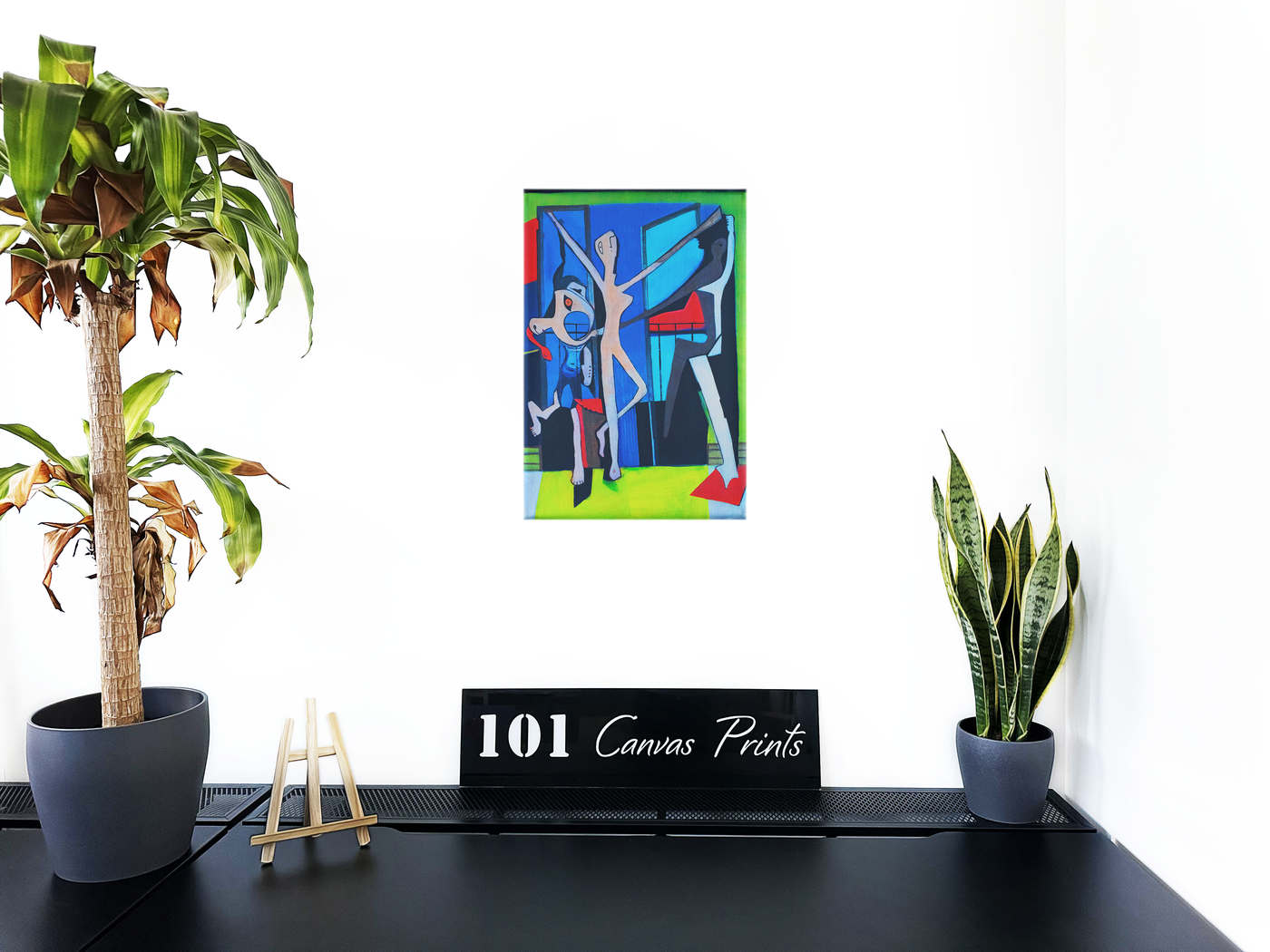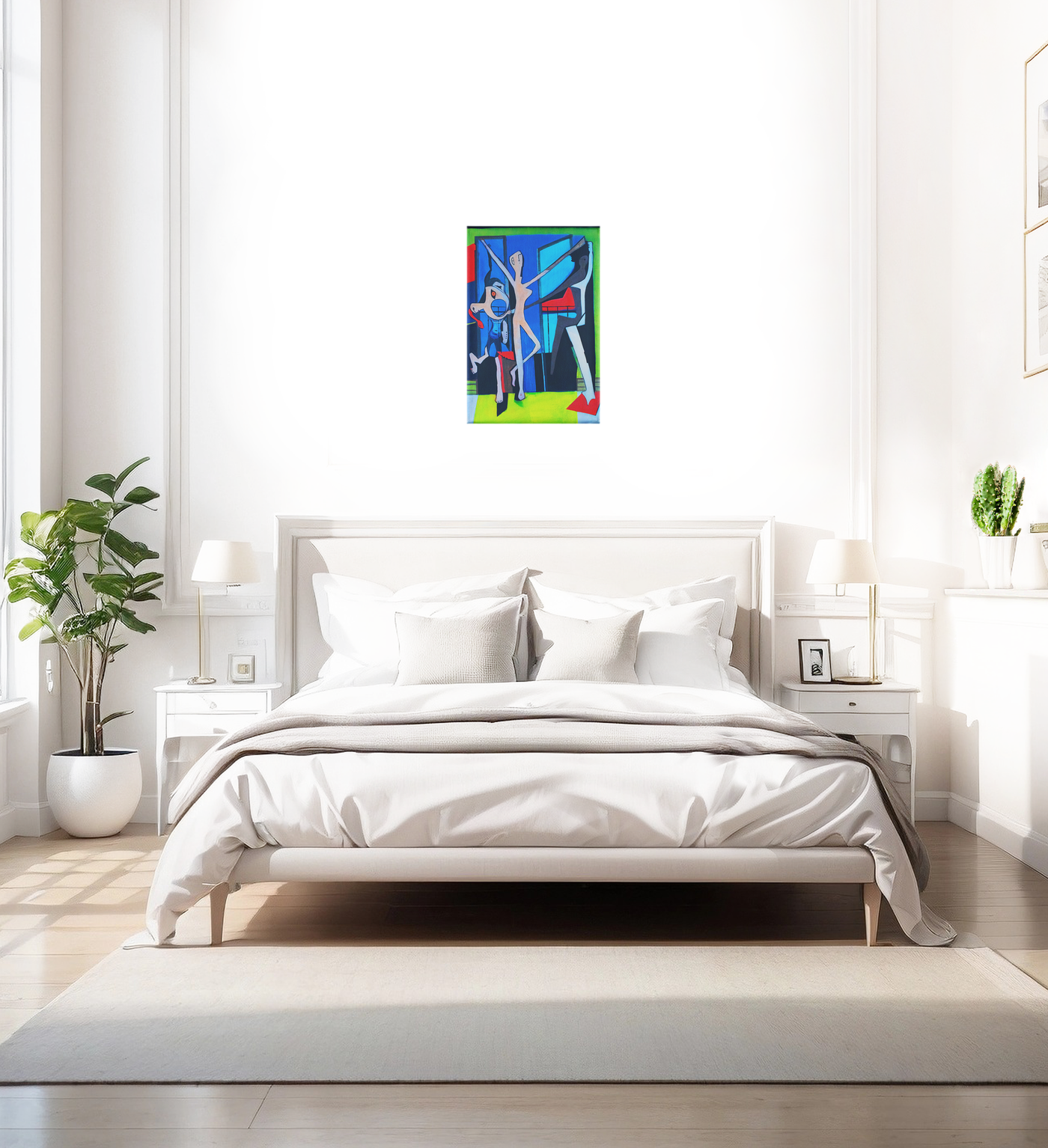 The colour palette is boldly contemporary yet thoughtfully composed, with deep cobalt blues dominating the central space, framed by energetic lime greens that suggest the festive atmosphere. Strategic touches of bright red add rhythm and movement to the composition, while the pale, ethereal figures stand out against the rich background colours. Our print enhancement team have preserved every intentional line and geometric form that gives the piece its distinctive character, ensuring that both the modernist influence and cultural narrative remain clear and impactful.